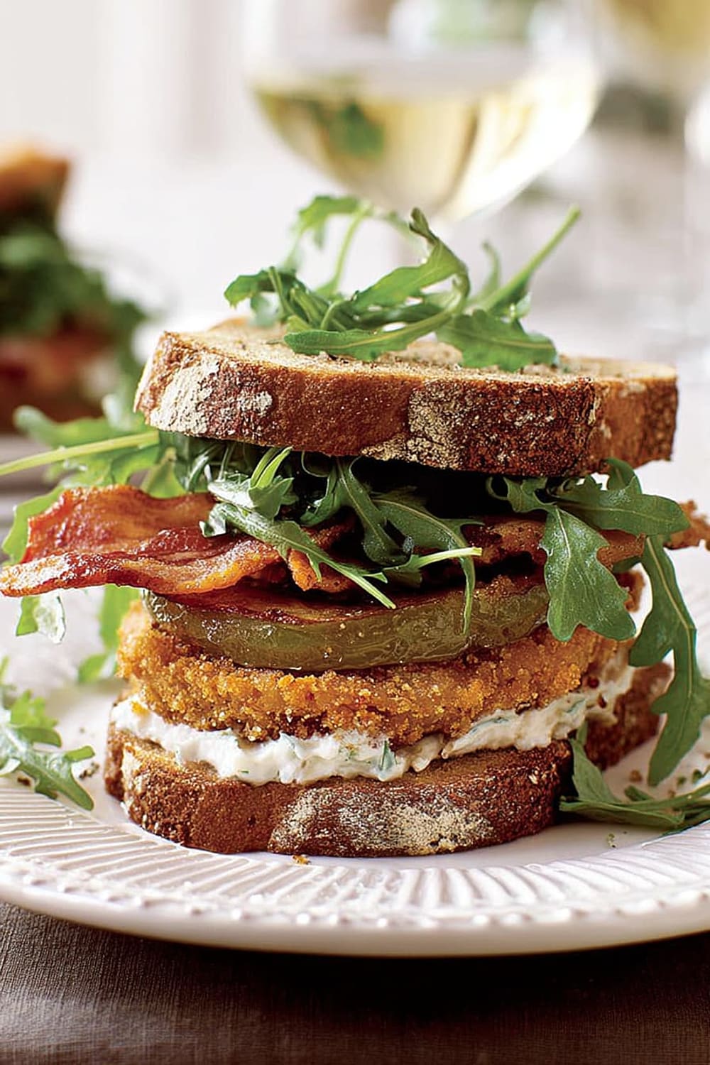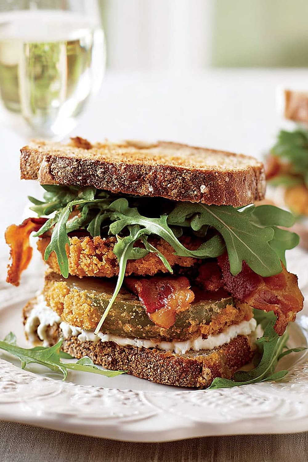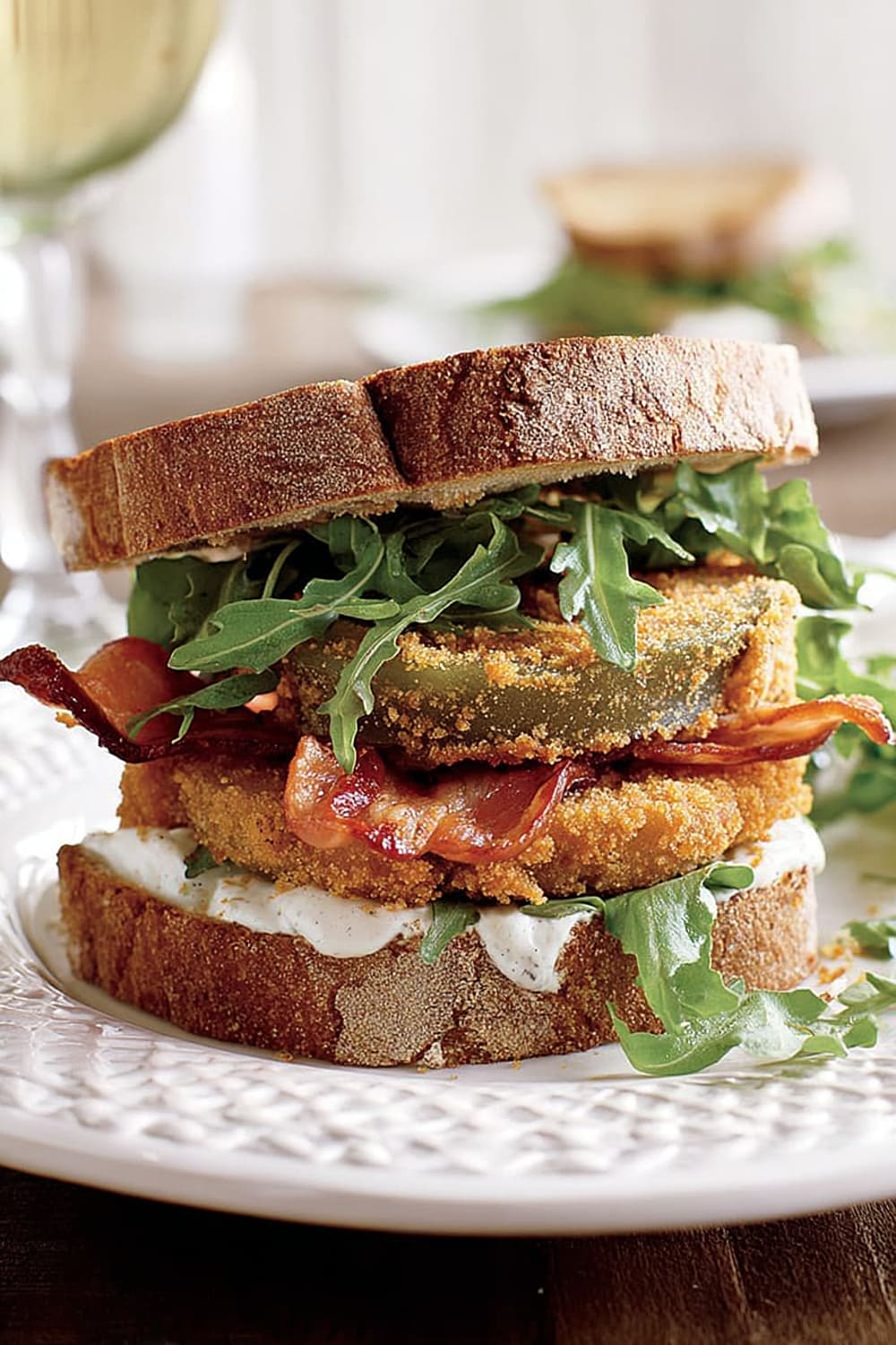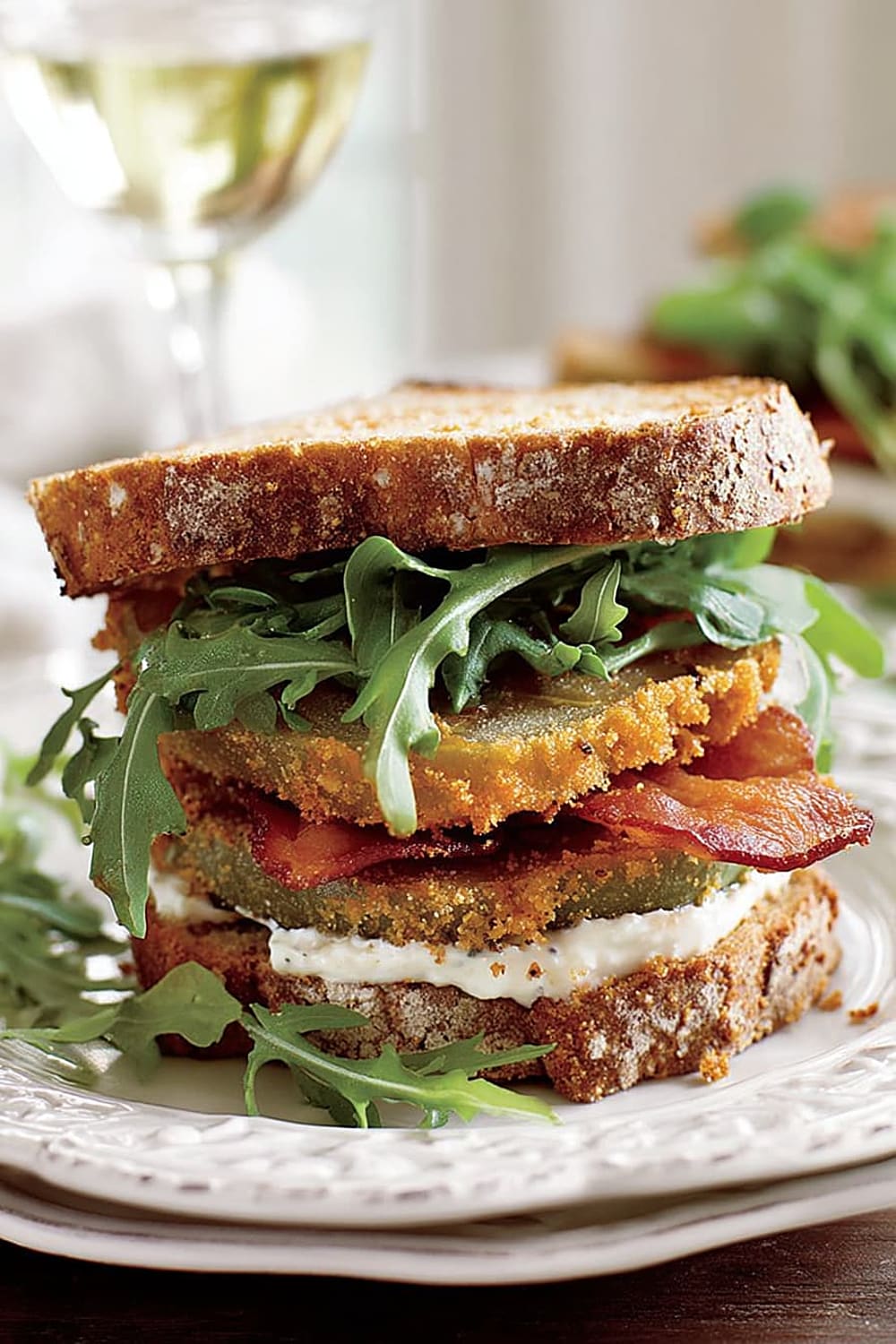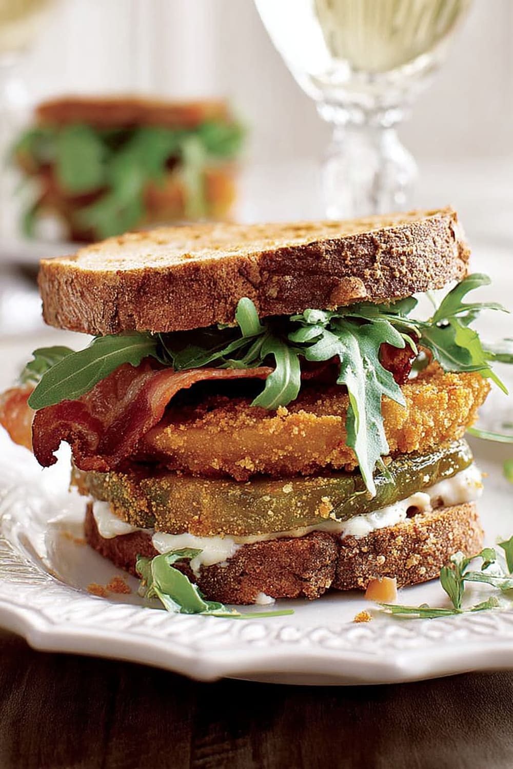 This recipe proves that some of the best comfort food comes from transforming simple, humble ingredients into something absolutely extraordinary. The combination of tangy green tomatoes, crispy coating, smoky bacon, and peppery arugula creates a sandwich that’s both familiar and exciting – the kind of meal that makes ordinary weekdays feel a little more special.