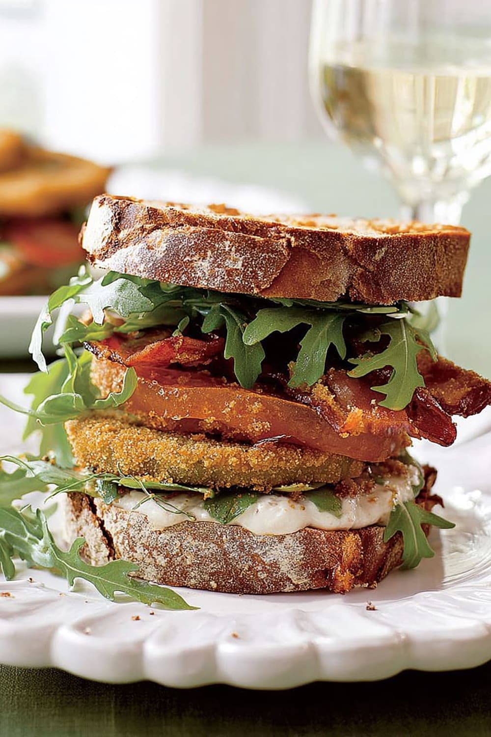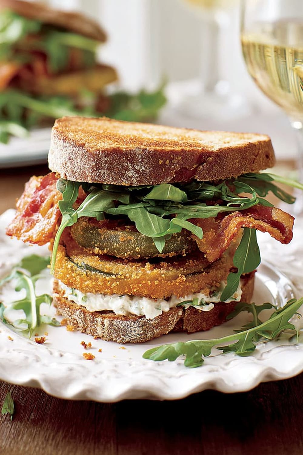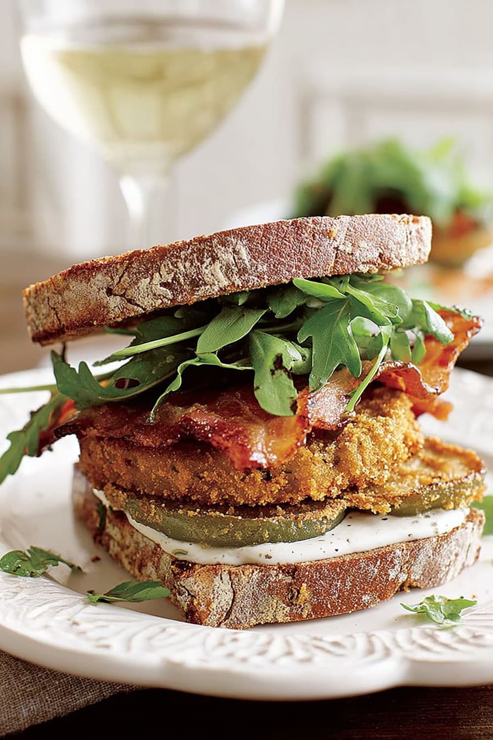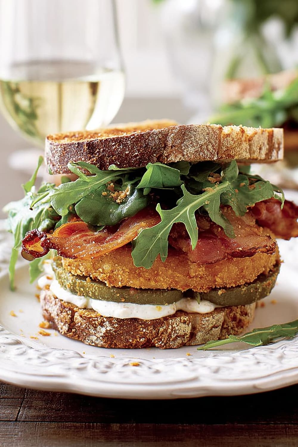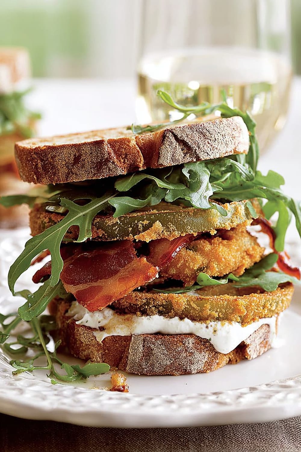 This recipe proves that some of the best comfort food comes from transforming simple, humble ingredients into something absolutely extraordinary. The combination of tangy green tomatoes, crispy coating, smoky bacon, and peppery arugula creates a sandwich that’s both familiar and exciting – the kind of meal that makes ordinary weekdays feel a little more special.