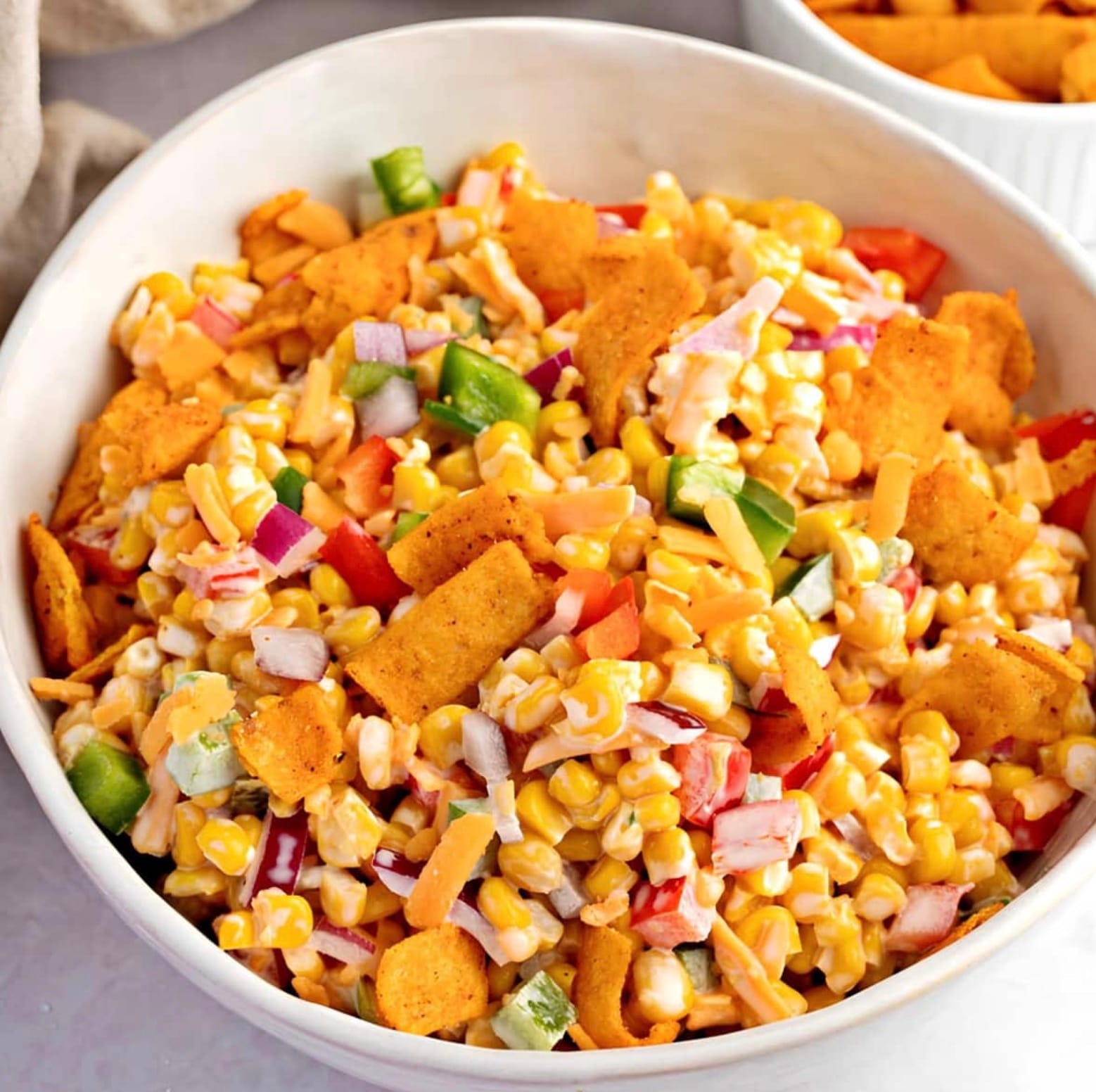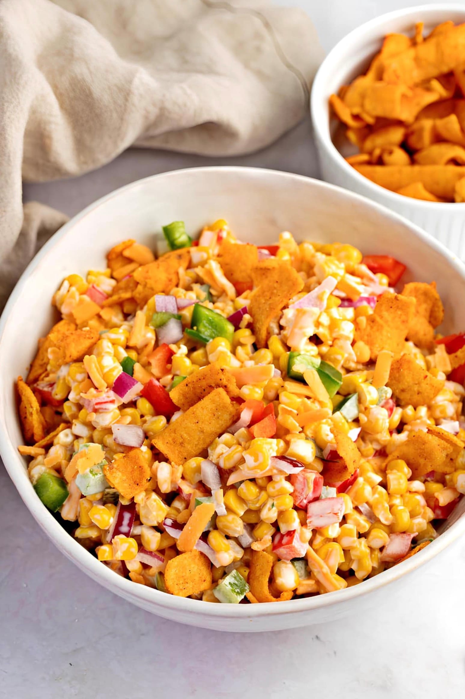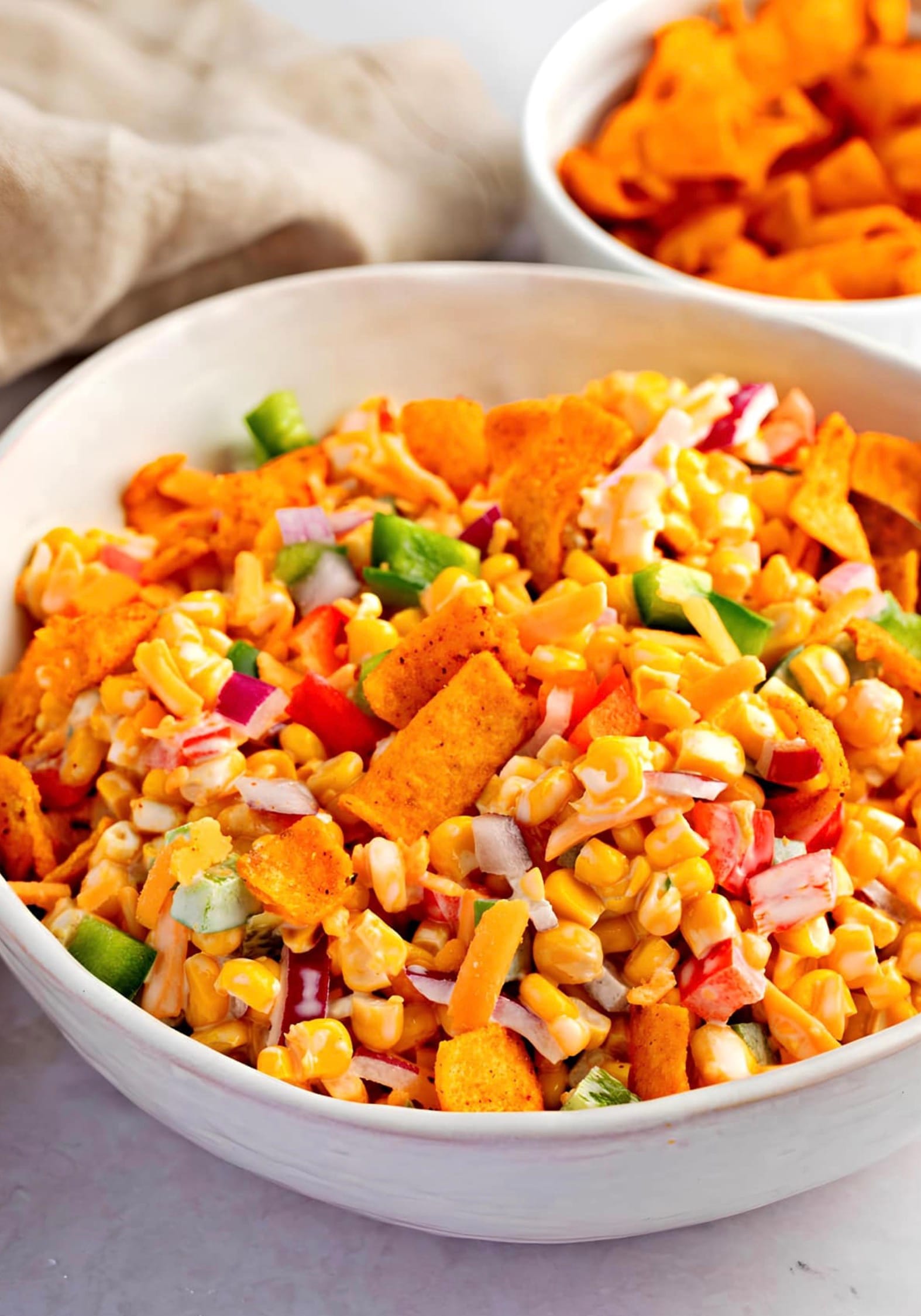 Remember to drain the corn well before adding it to the salad. Chop the peppers and onion into small, bite-sized pieces. The chili cheese Fritos add a nice kick, but you can use regular Fritos if you prefer.