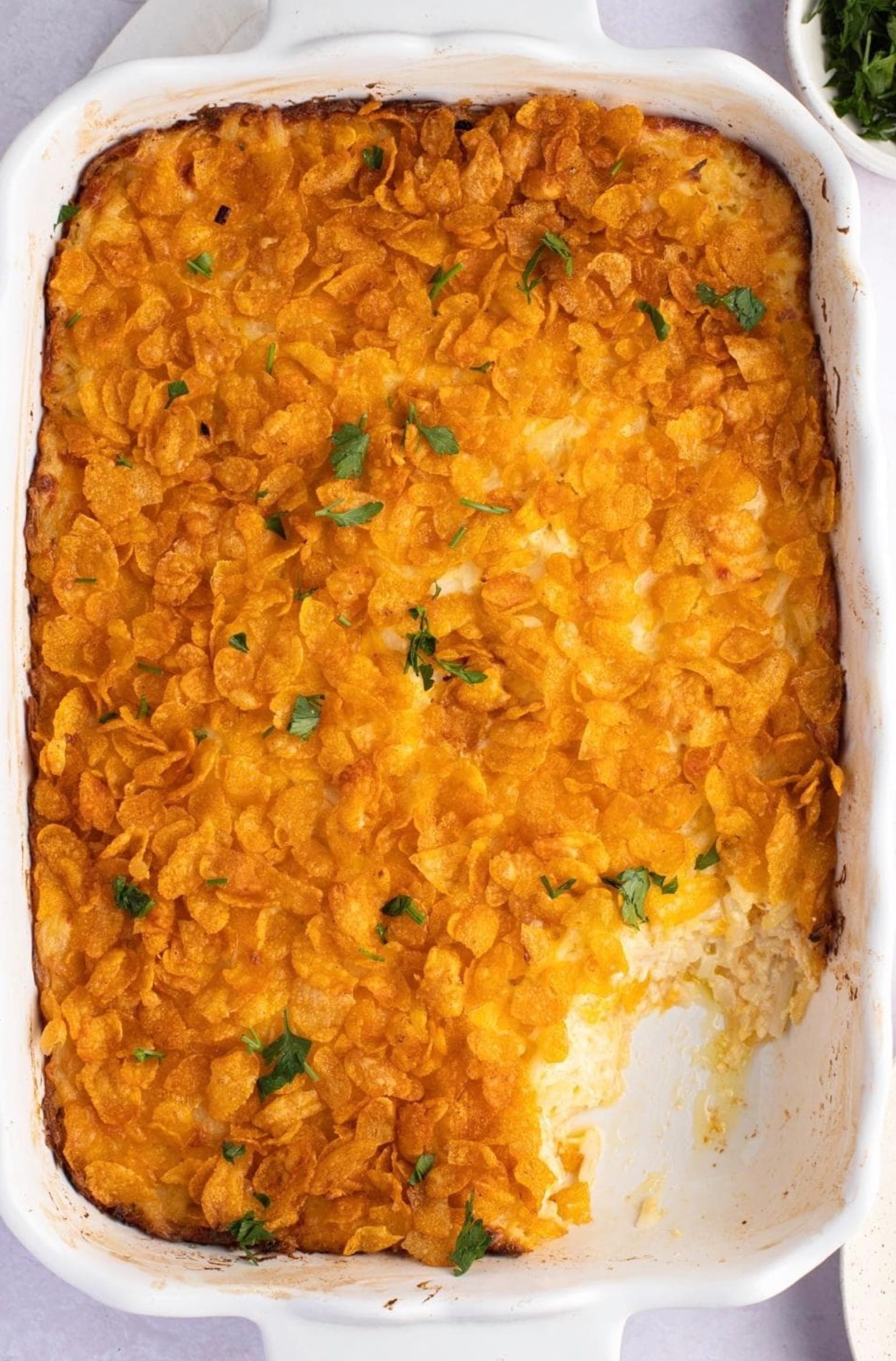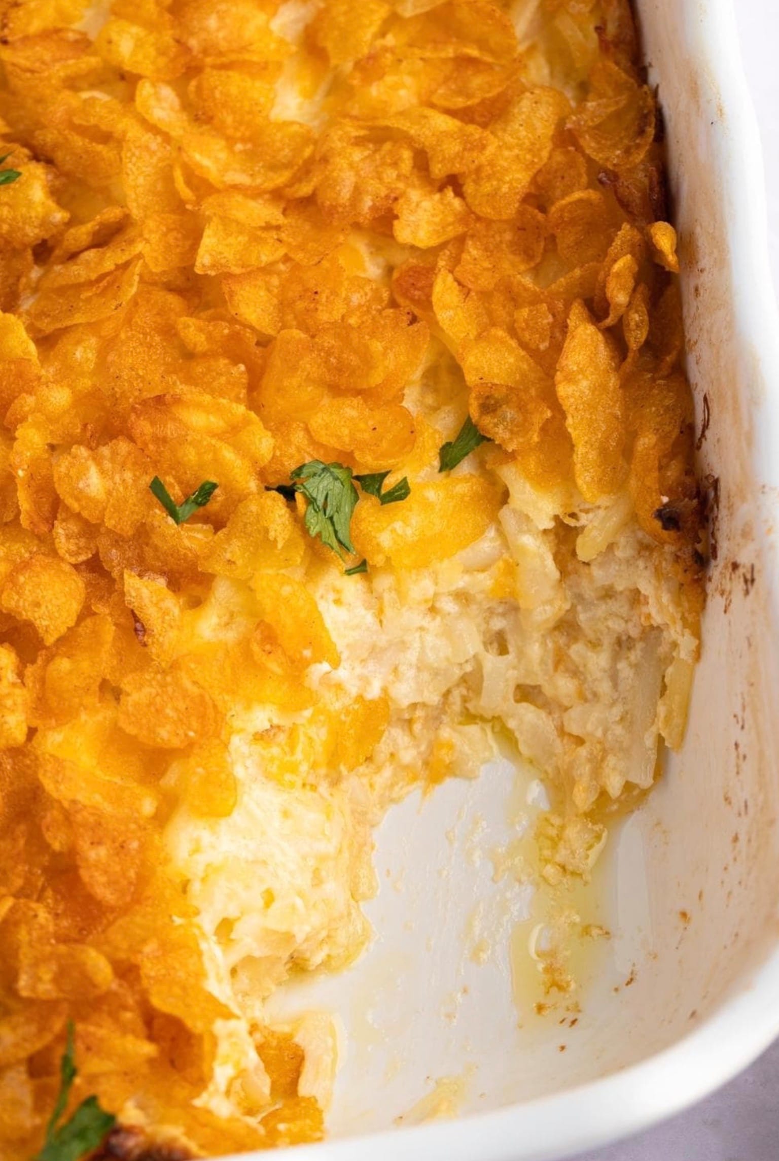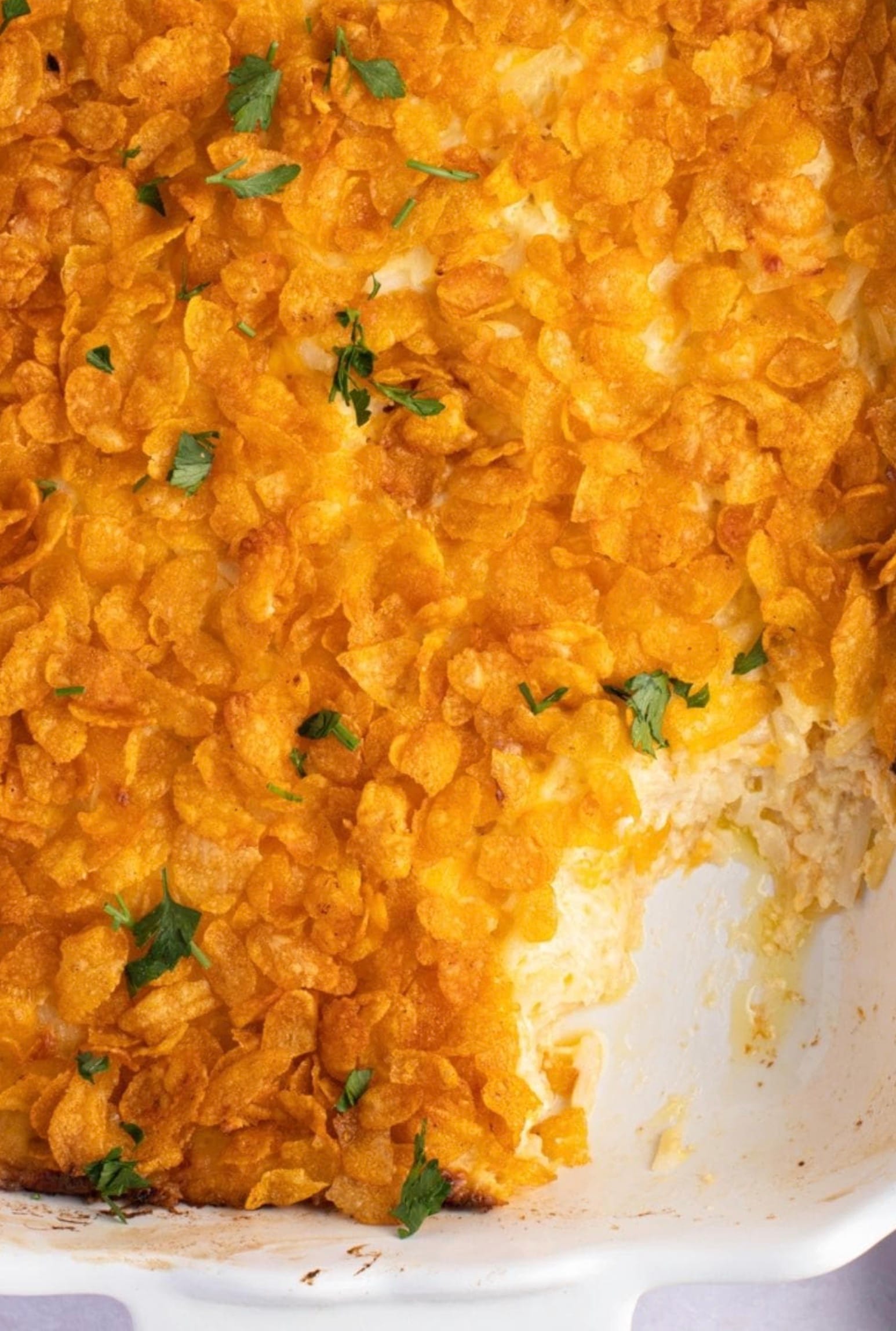 To make funeral potatoes, you’ll mix the thawed hash browns with a creamy sauce and top it with crispy cornflakes. The casserole bakes for about 45 minutes until hot and bubbly. The result is a crowd-pleasing side dish that’s creamy, cheesy, and comforting.