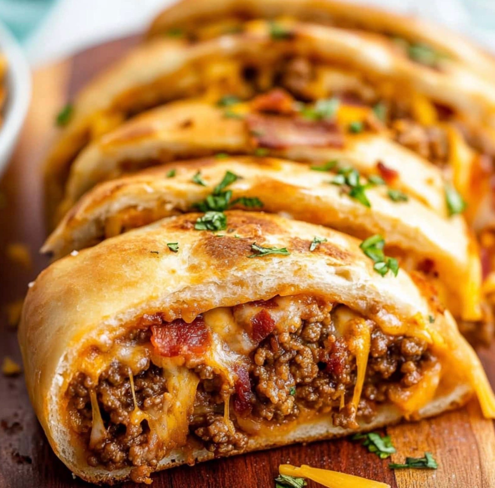You’ll love how simple it is to put together. The recipe uses pizza dough as a base, which you fill with a mix of cooked meat and spices. Then you roll it up, bake it, and slice it. It’s a fun twist on a classic cheeseburger that’s sure to please your family or guests.