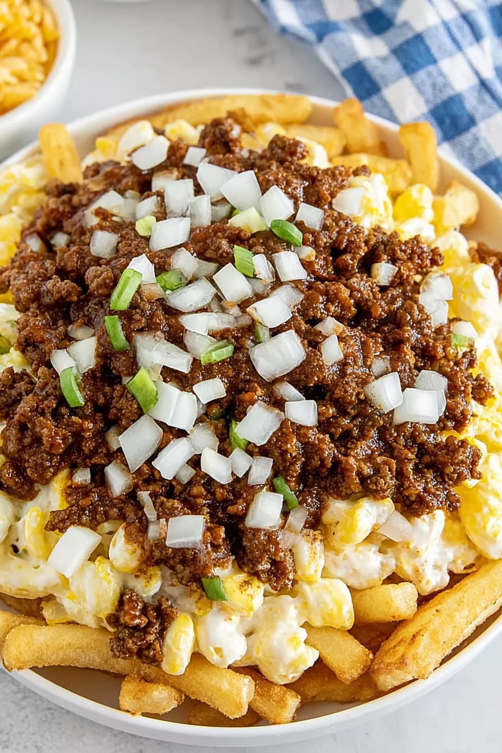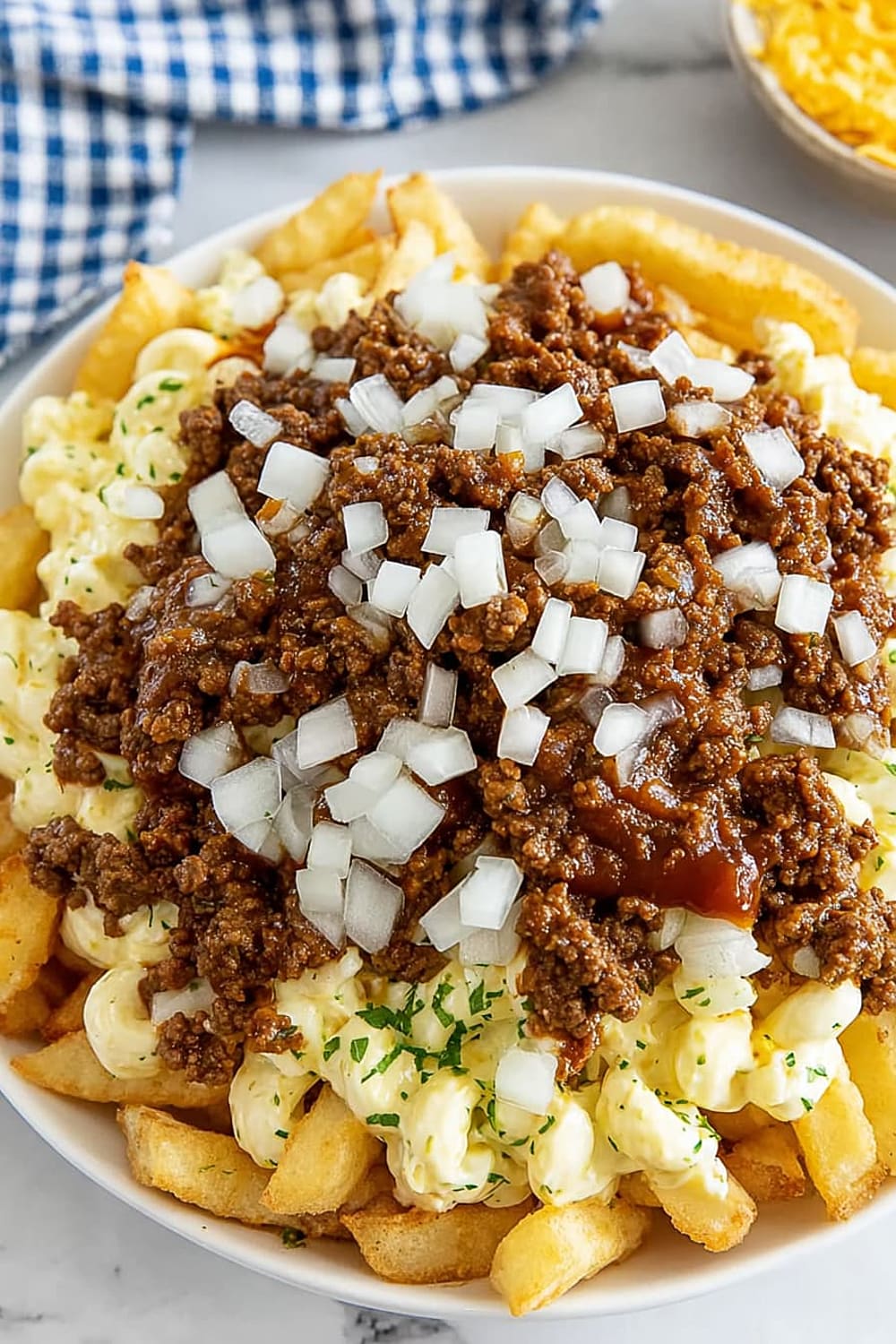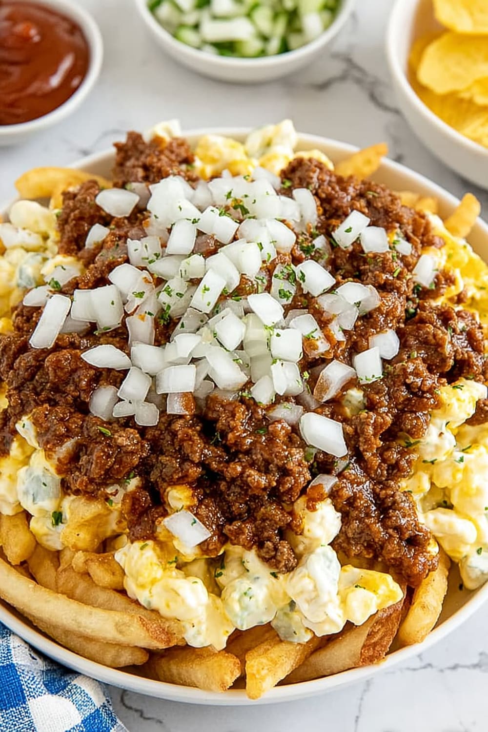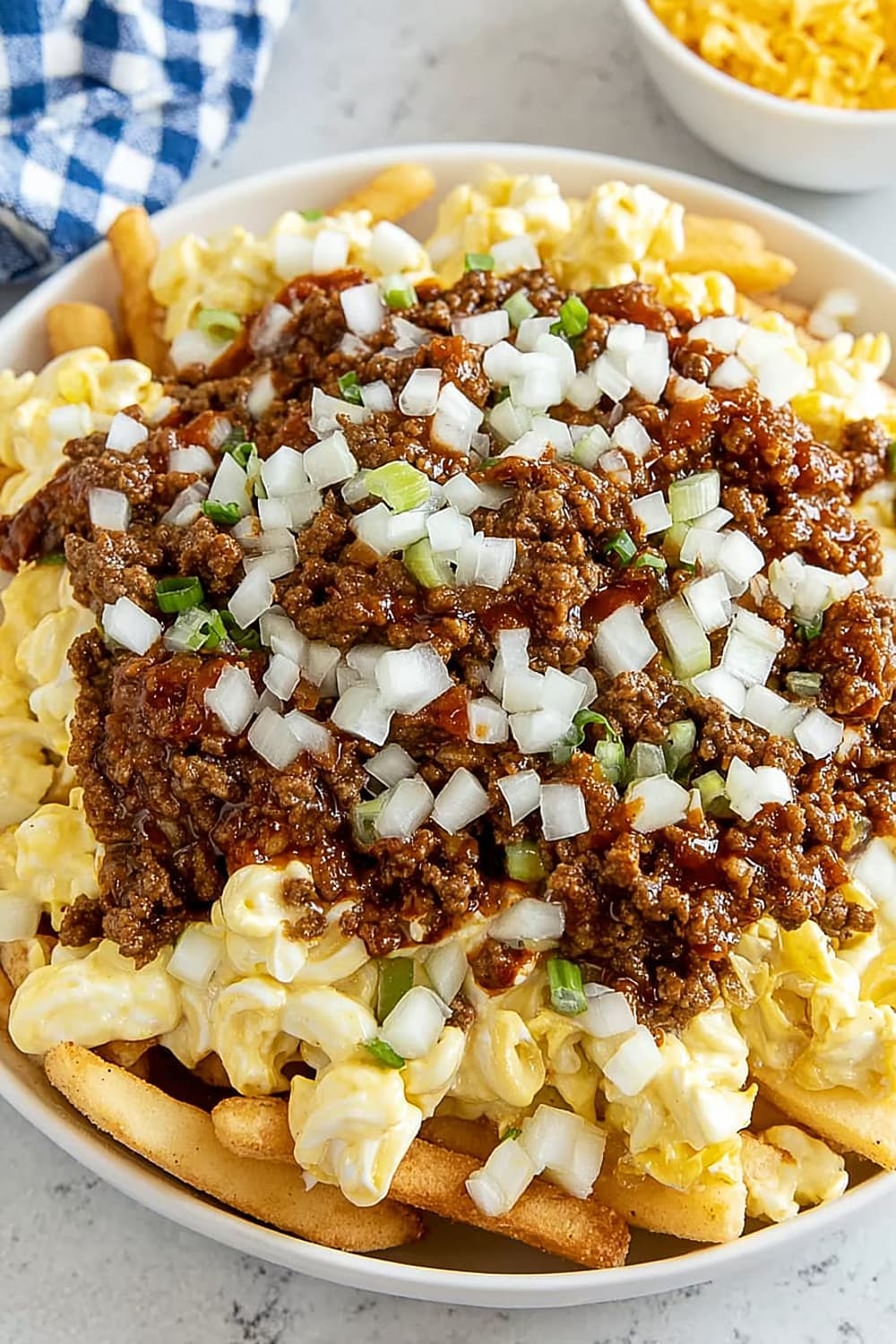 Picture this: crispy fries, creamy mac salad, juicy cheeseburgers, and tangy meat hot sauce all piled together on one glorious plate that defies every food presentation rule you’ve ever heard.