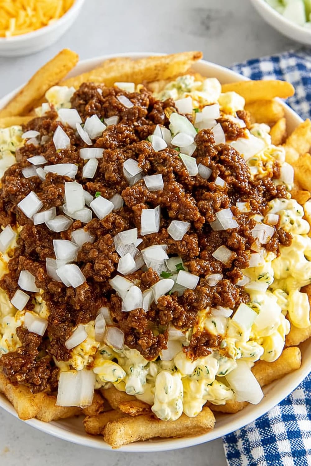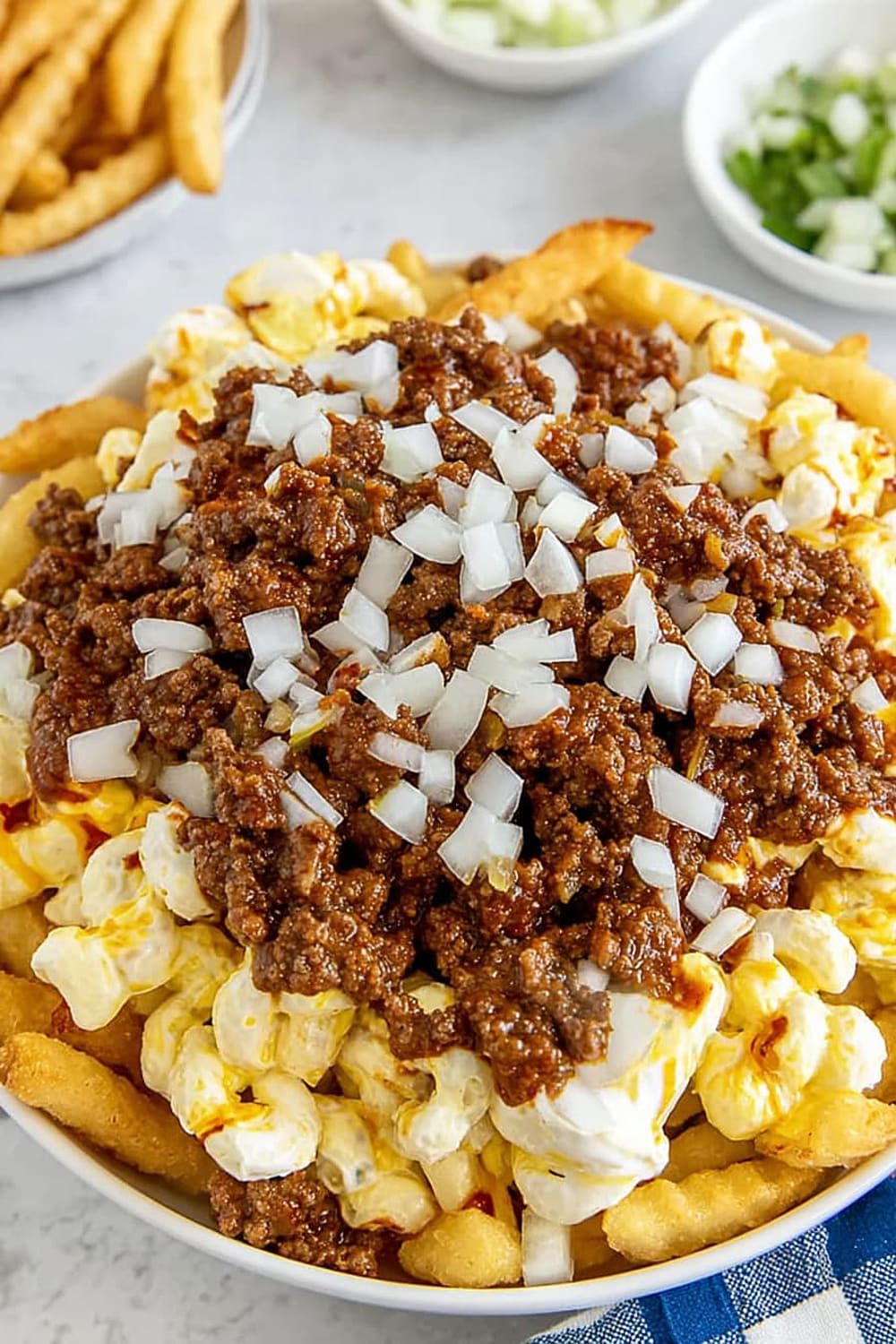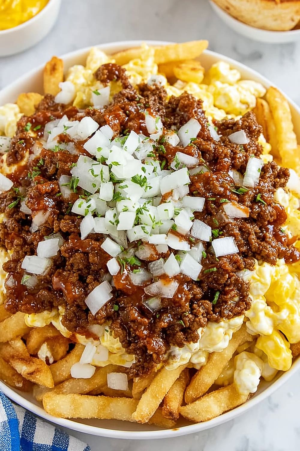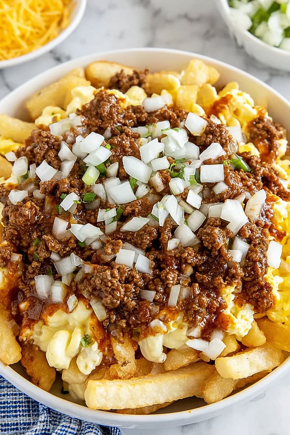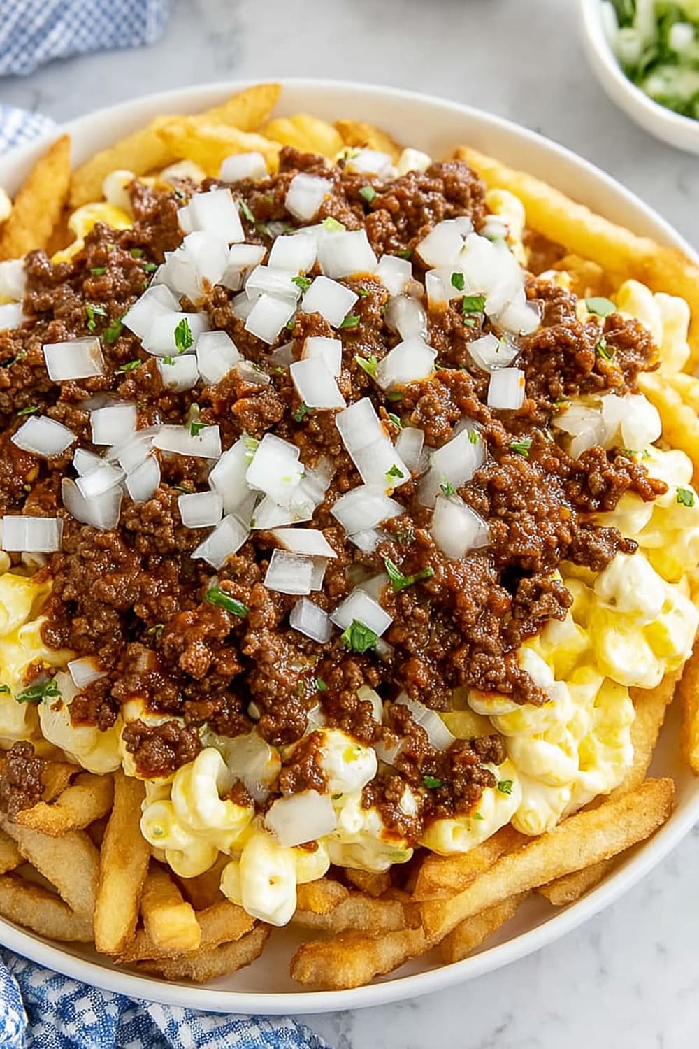 Picture this: crispy fries, creamy mac salad, juicy cheeseburgers, and tangy meat hot sauce all piled together on one glorious plate that defies every food presentation rule you’ve ever heard.