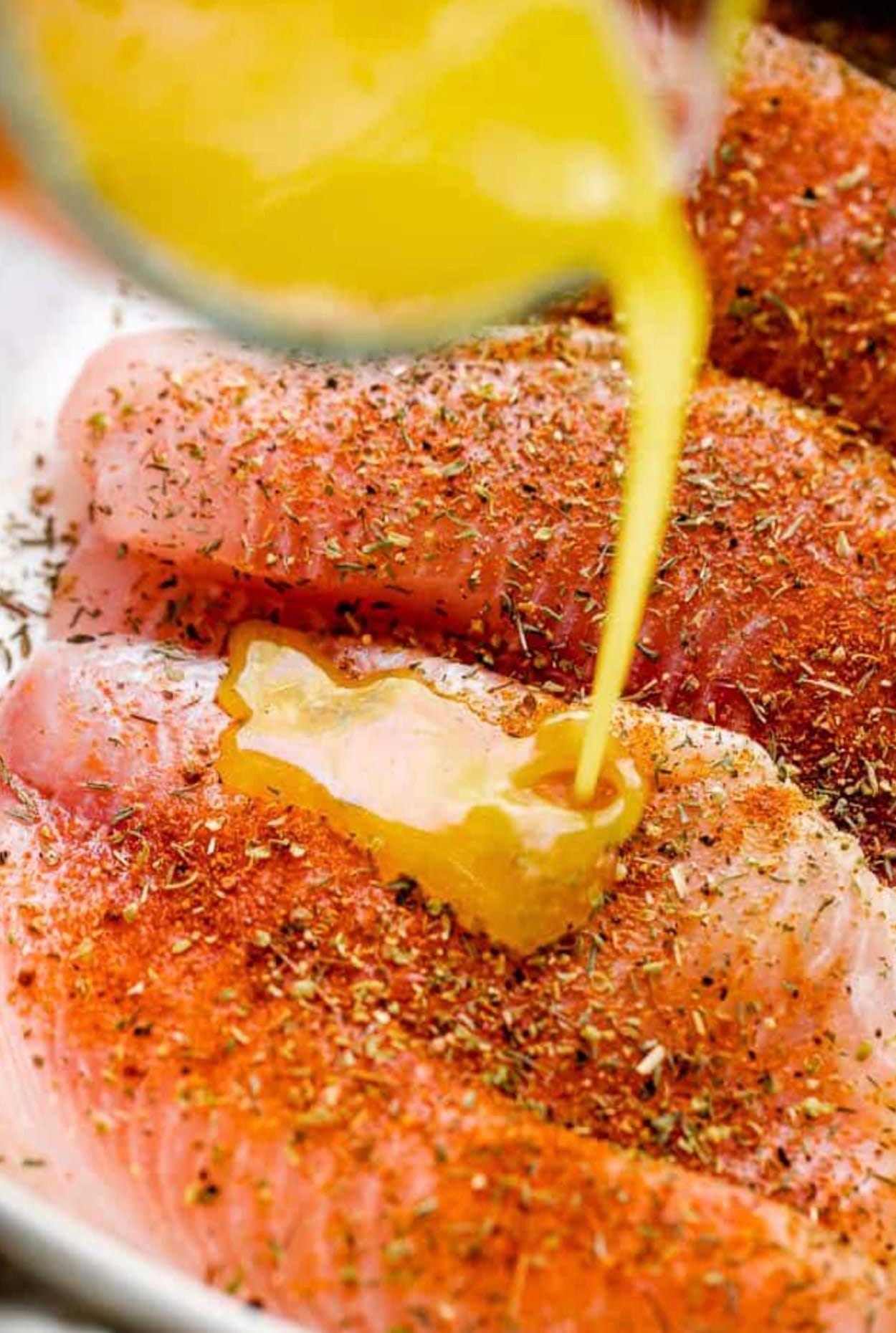 Pour this tasty mixture over your tilapia fillets. Make sure each piece is coated evenly.