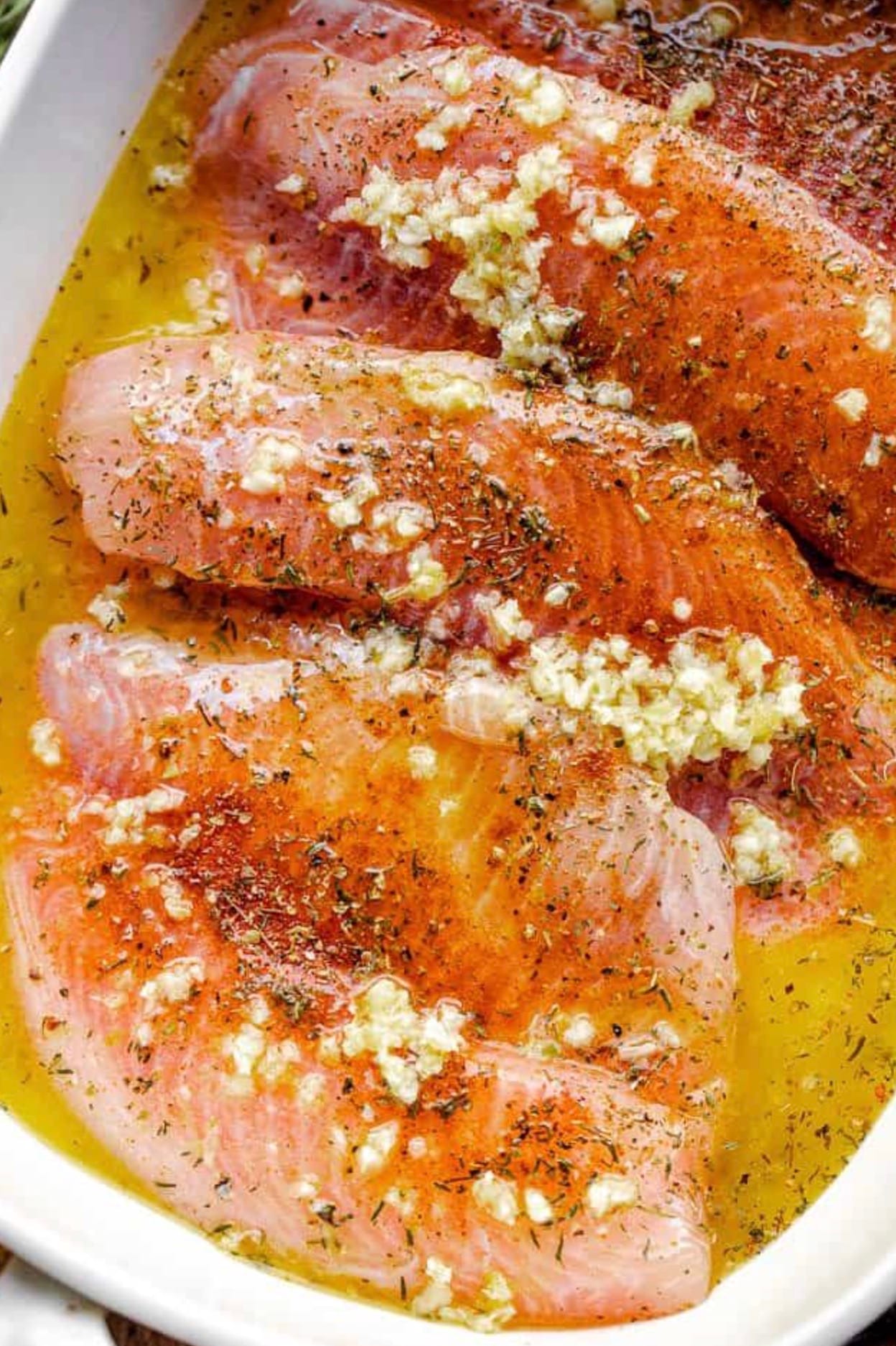 Next, grab your tilapia fillets and season them. Sprinkle salt, pepper, paprika, thyme, and oregano on both sides. Place the seasoned fish in a 9×13 inch baking dish.