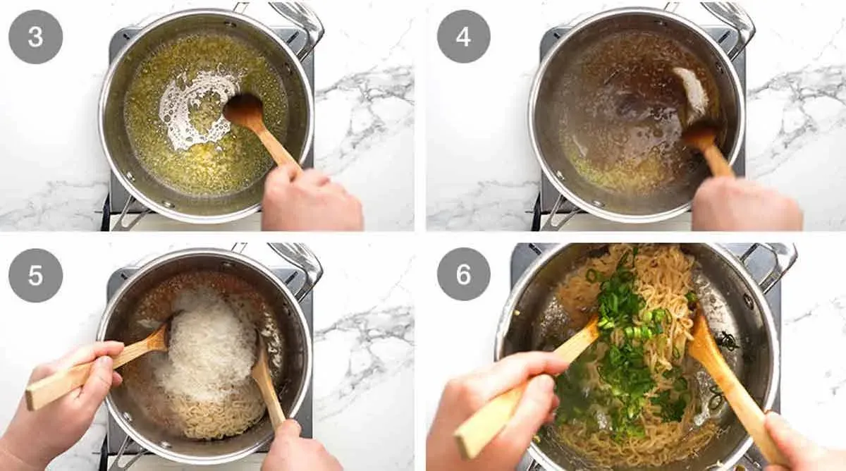 You can use ramen noodles or other noodle options to create this tasty dish. The sauce comes together in a pan with butter, minced garlic, oyster sauce, fish sauce, and Maggi seasoning. Toss in your cooked noodles, Parmesan, and green onions for a simple yet delicious meal or side.
