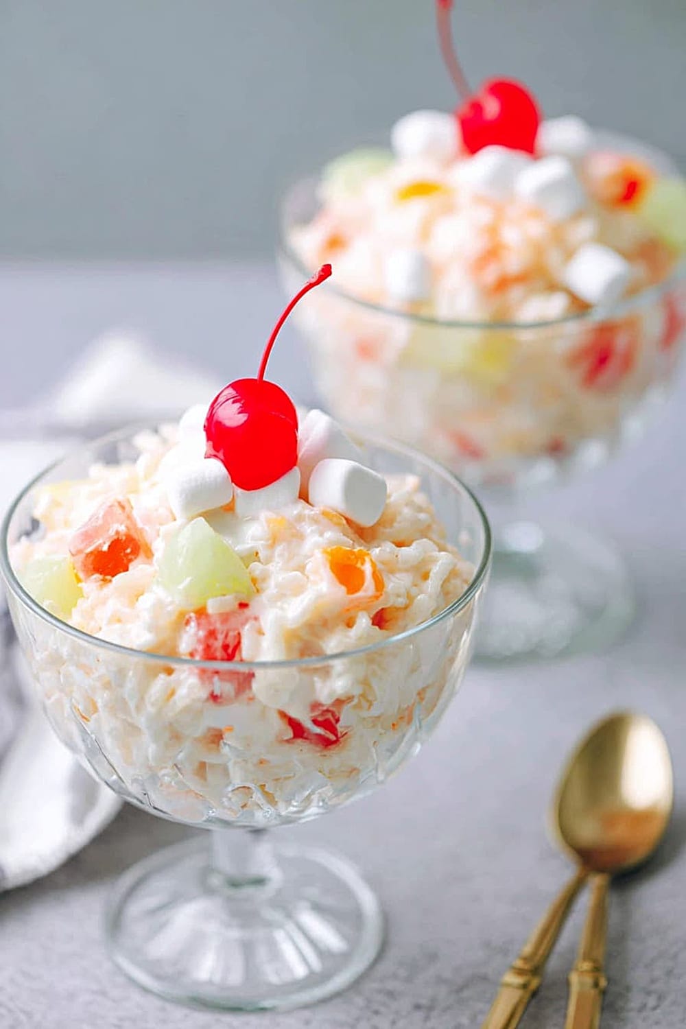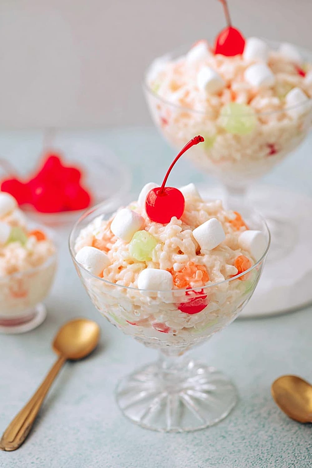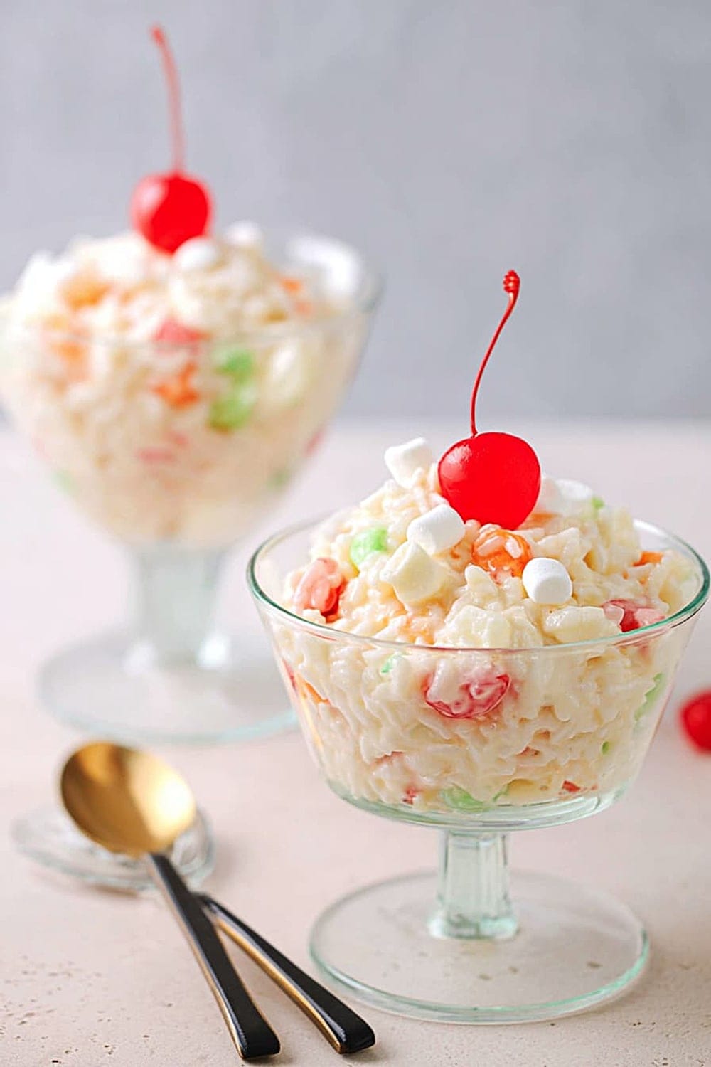 Prepare up to 24 hours ahead – flavors actually improve with time as they meld together. Store covered in refrigerator for up to 3 days, though texture is best within 48 hours. Don’t freeze – Cool Whip separates and rice becomes mushy when thawed. Refresh before serving with a gentle stir and fresh cherry garnishes.