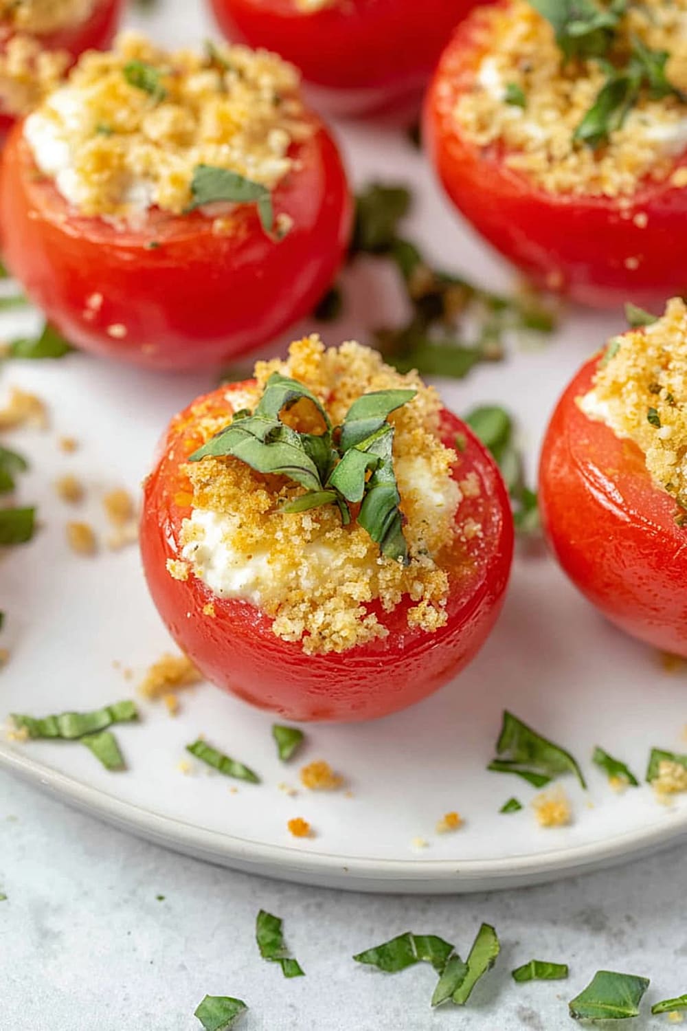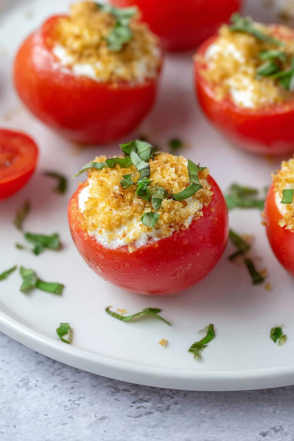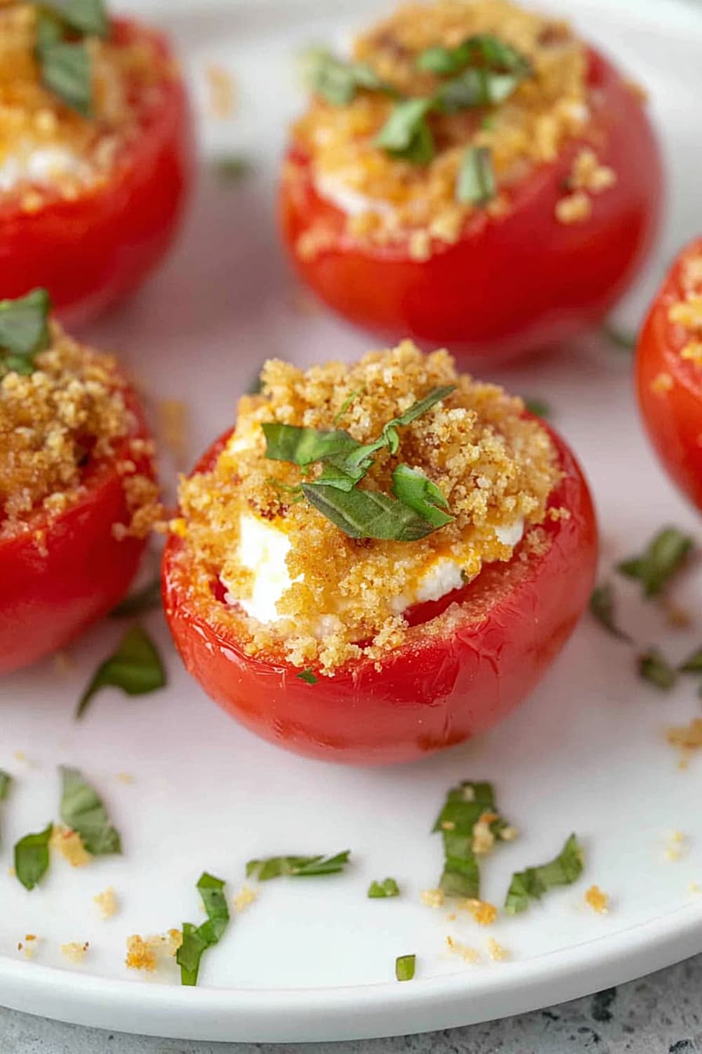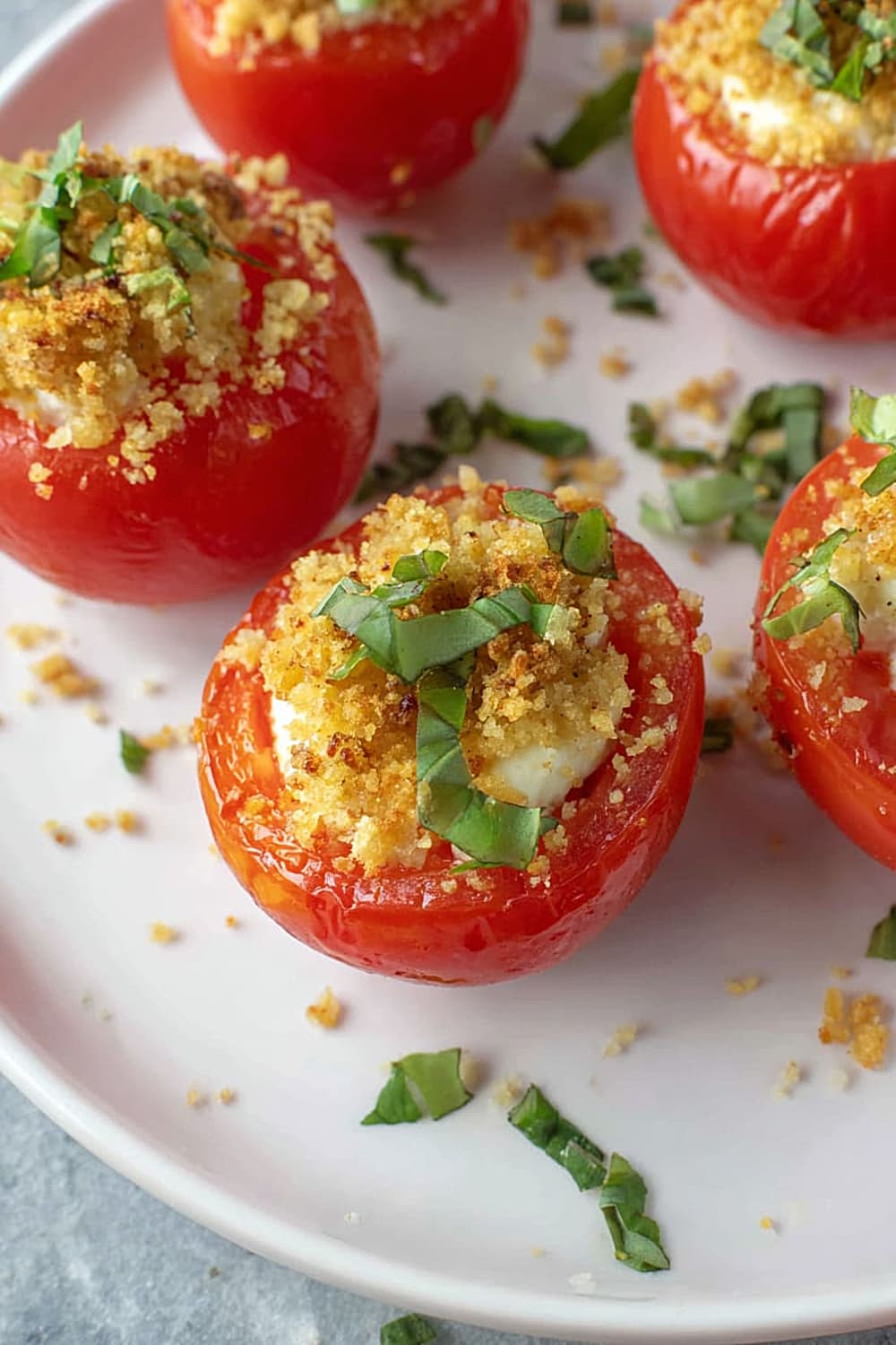 - 8 Sprinkle each filled tomato generously with the toasted panko breadcrumbs, pressing gently so they adhere to the cheese filling. Finish with a sprinkle of fresh chopped basil for that pop of color and fresh herb flavor. Serve immediately for the best texture contrast.