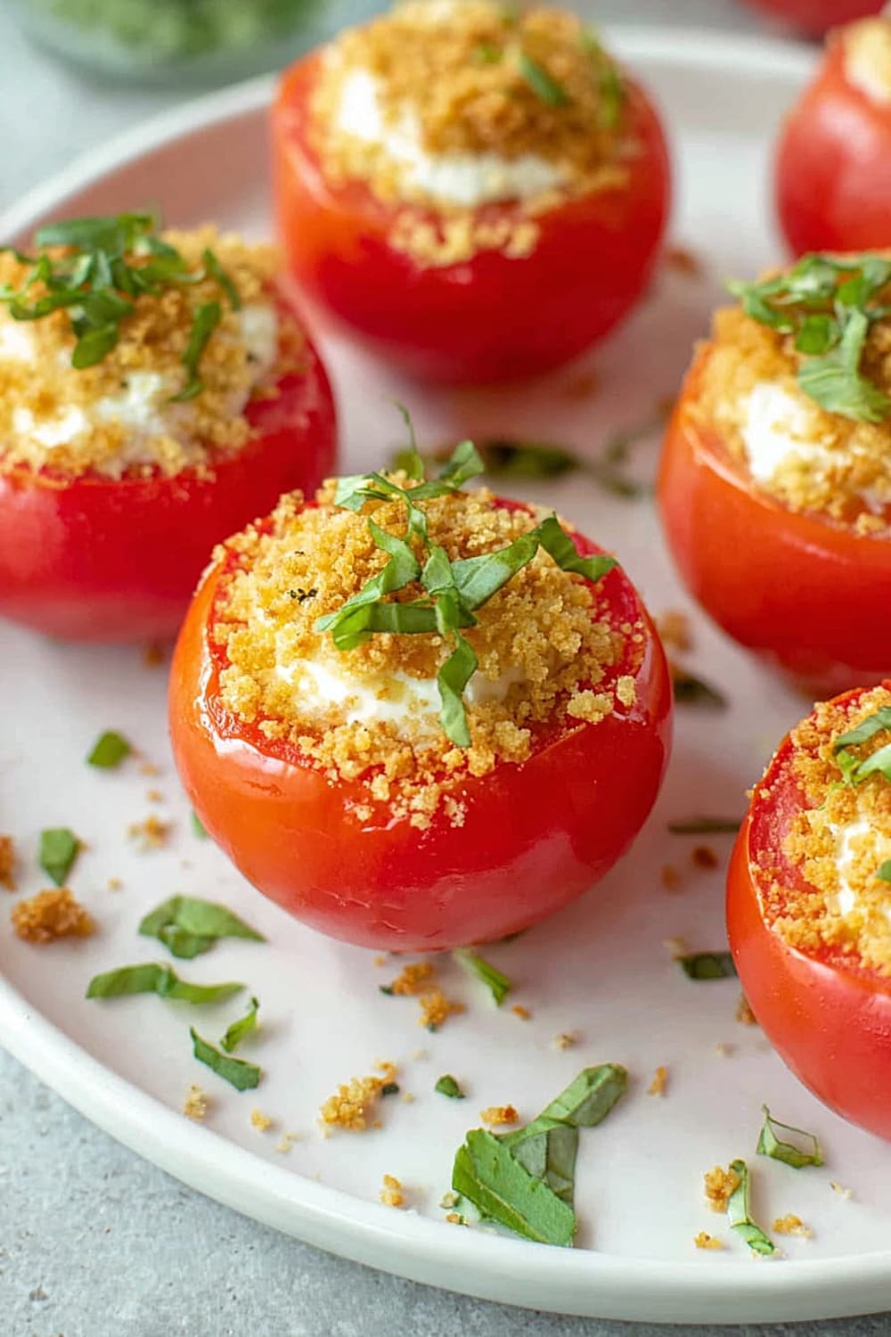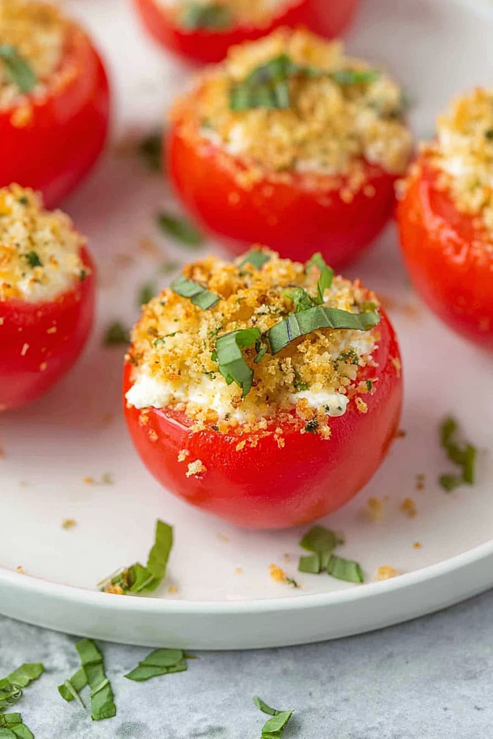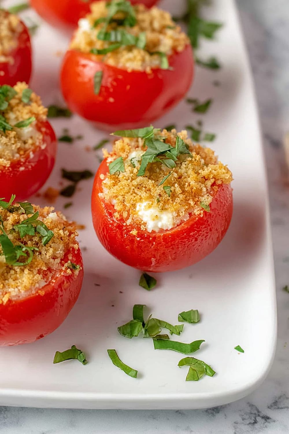 - 8 Sprinkle each filled tomato generously with the toasted panko breadcrumbs, pressing gently so they adhere to the cheese filling. Finish with a sprinkle of fresh chopped basil for that pop of color and fresh herb flavor. Serve immediately for the best texture contrast.