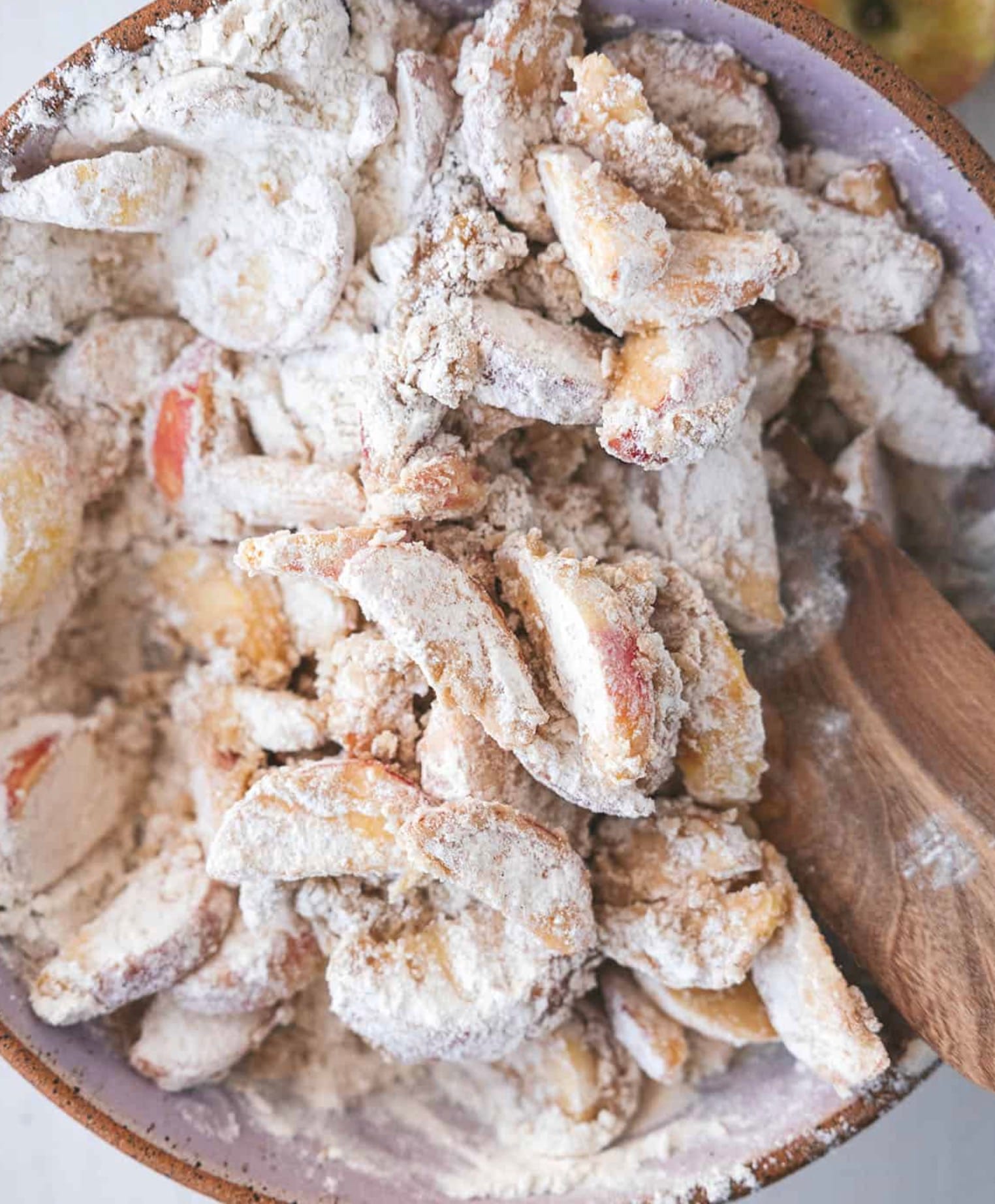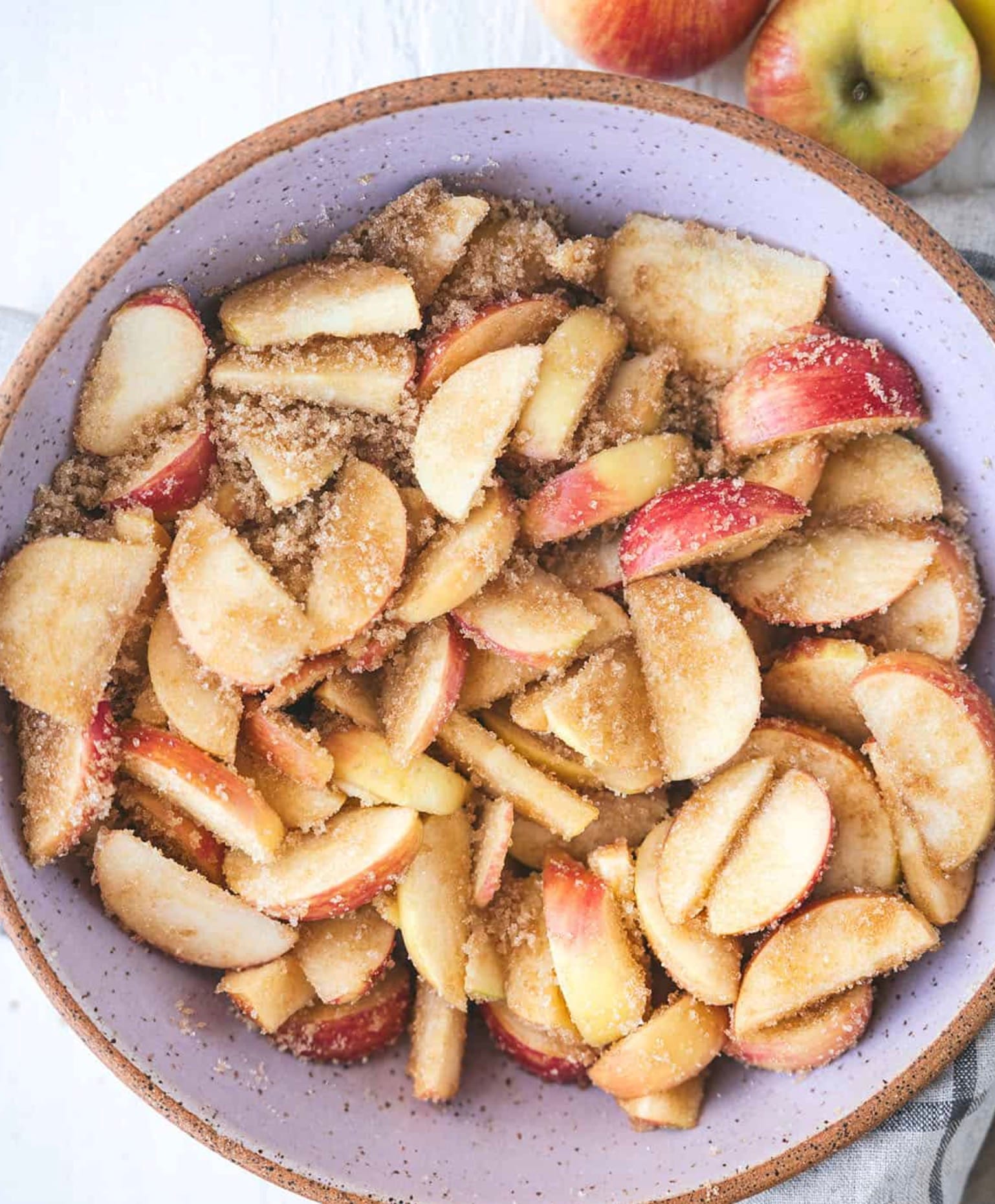Start by mixing the sliced apples with sugar and brown sugar in a large bowl. Let this sit for 30 minutes or more to bring out the apple juices.