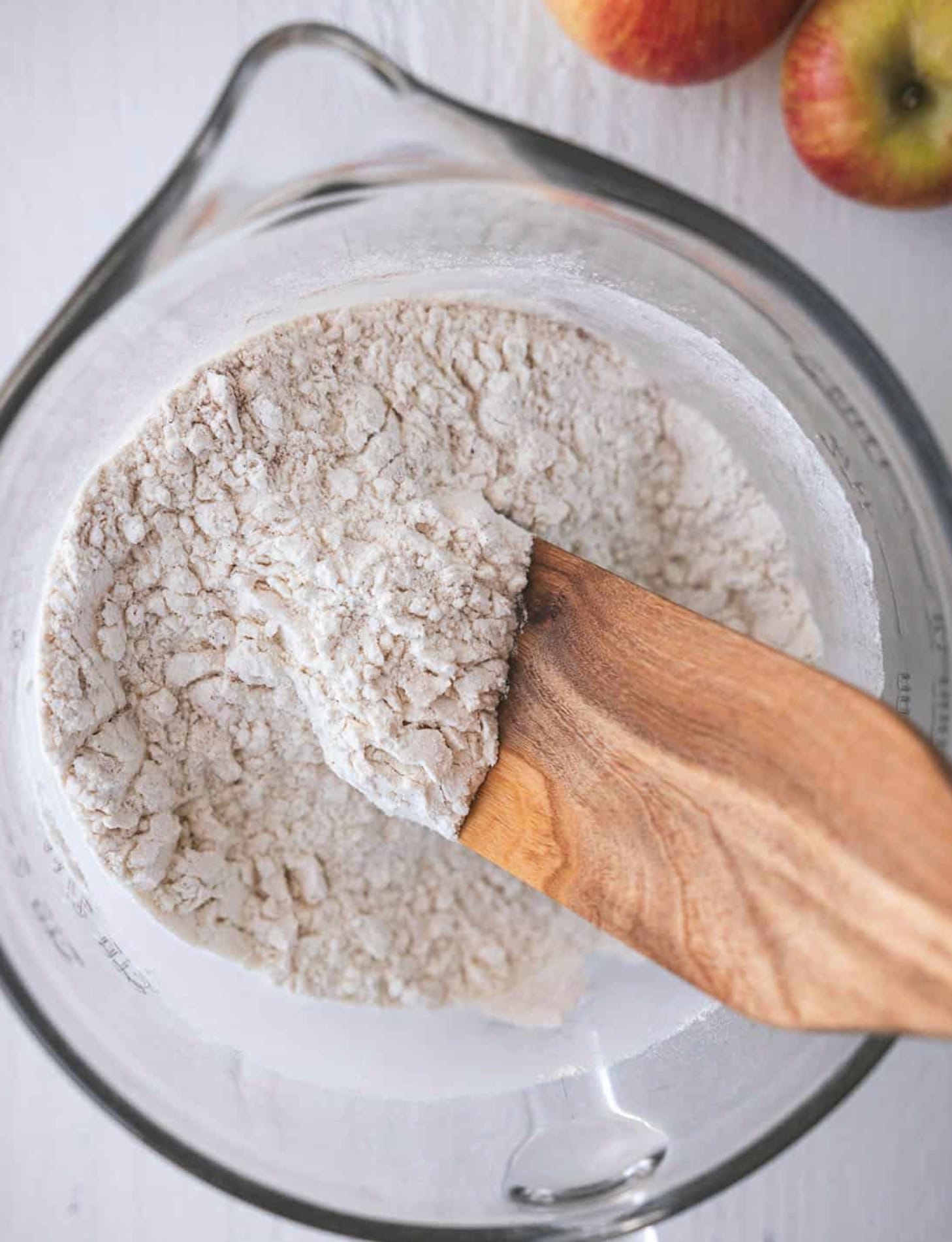 In a medium bowl, combine the flour, baking soda, cinnamon, and salt. Add this dry mix to the apple mixture and stir well.
