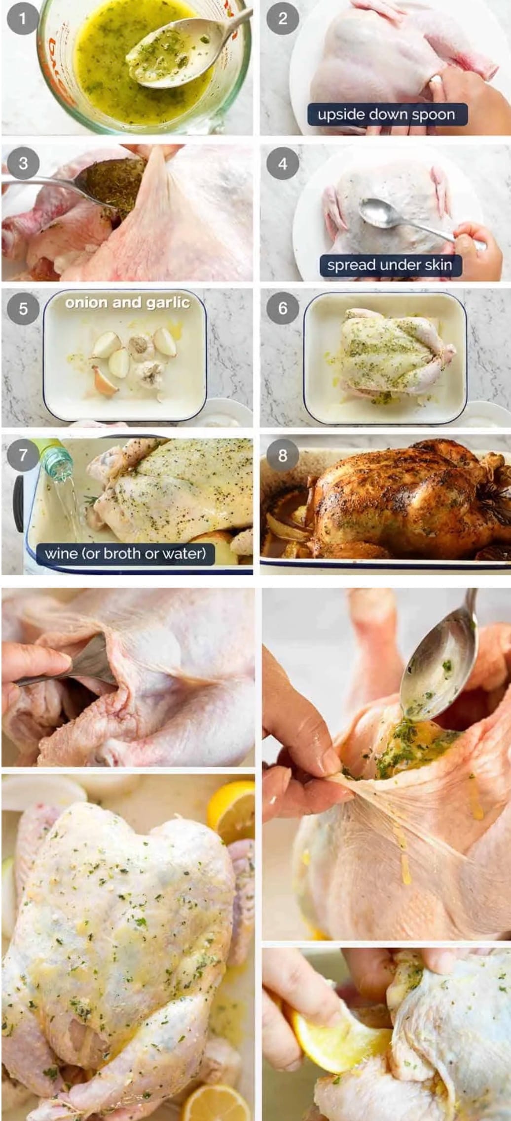 Put the chicken in a roasting pan. Use a spoon to gently loosen the skin from the meat. Focus on the breast and drumsticks.