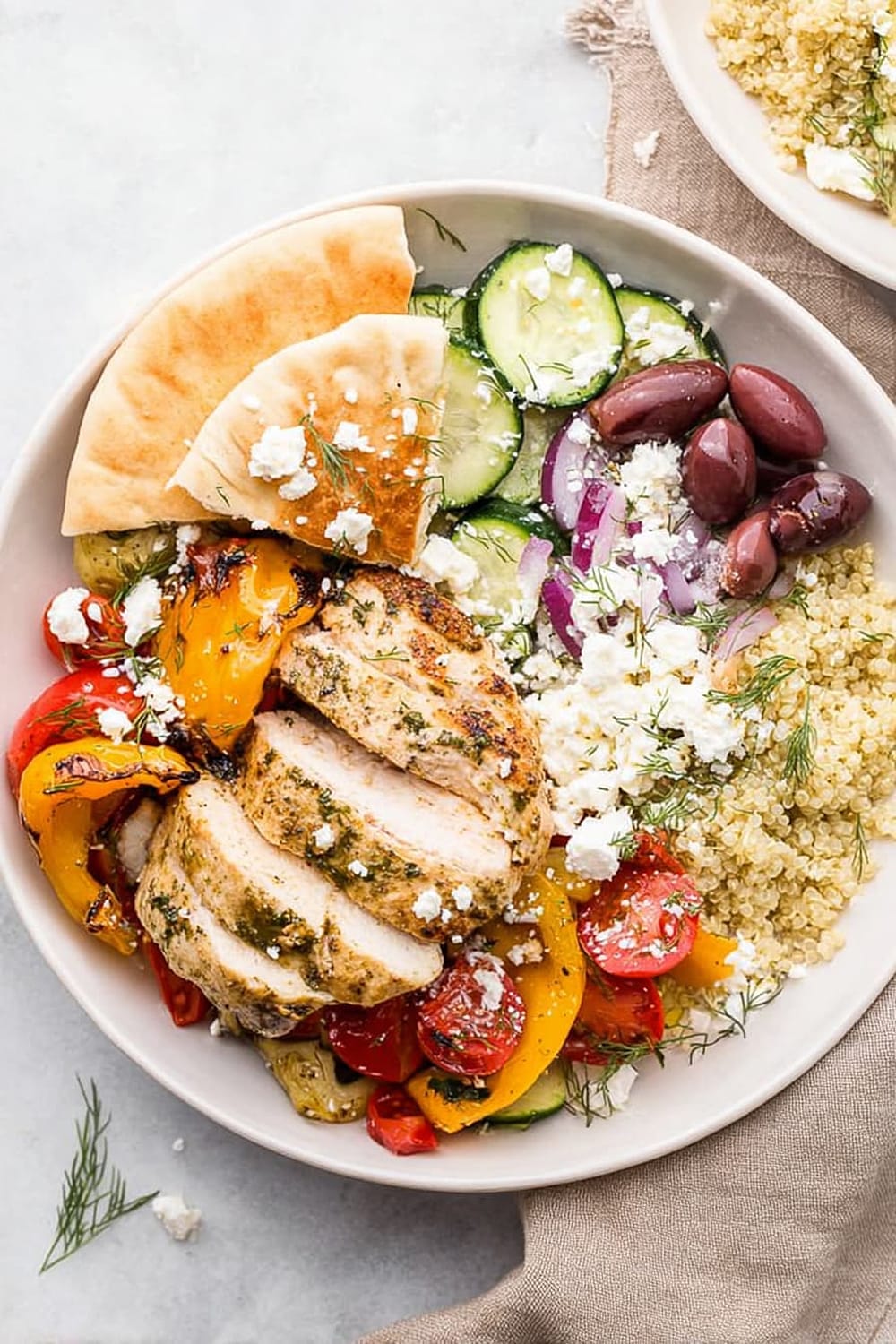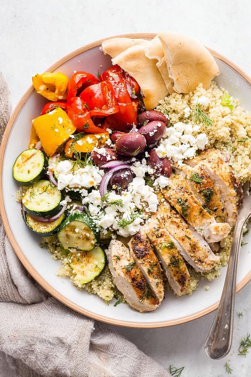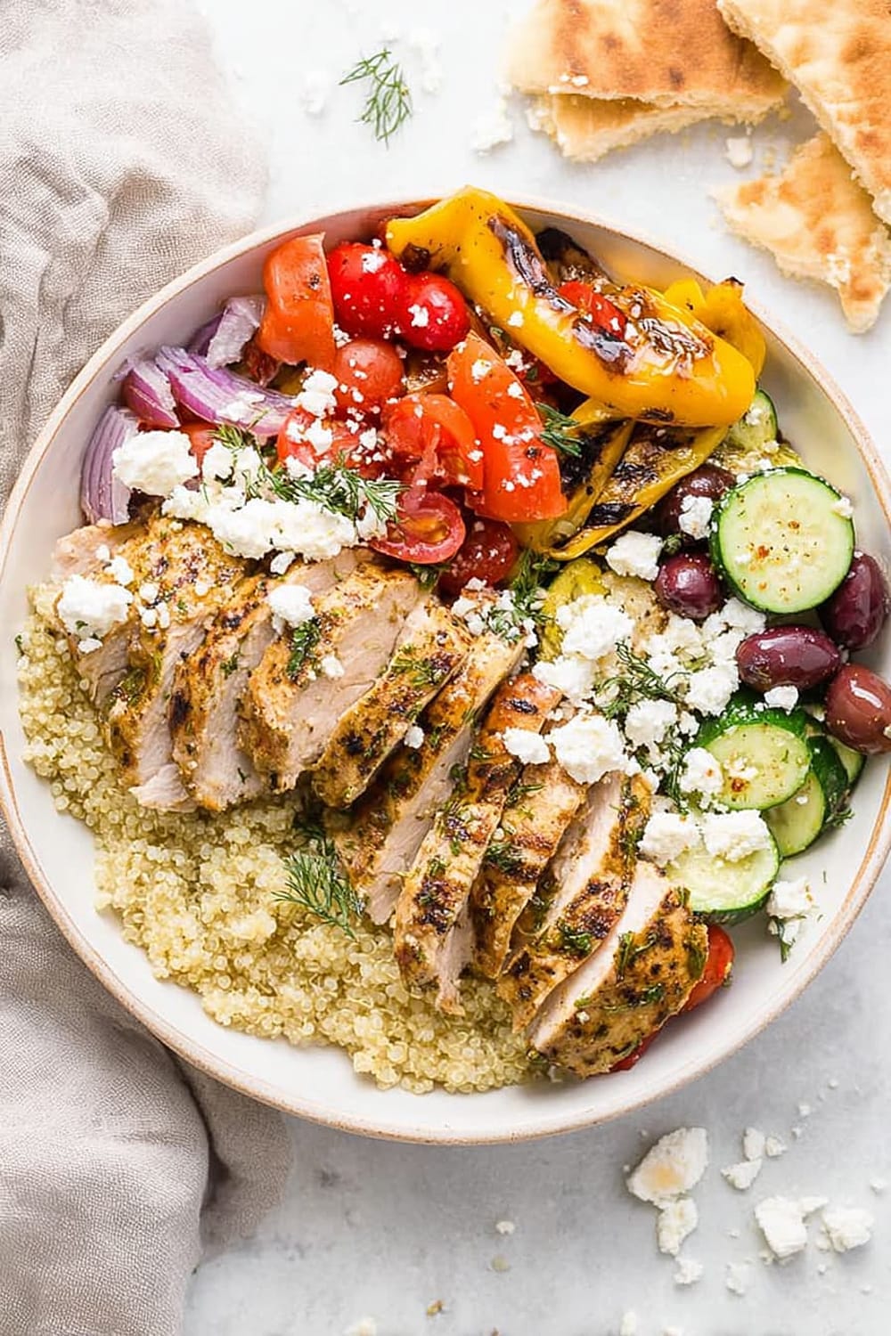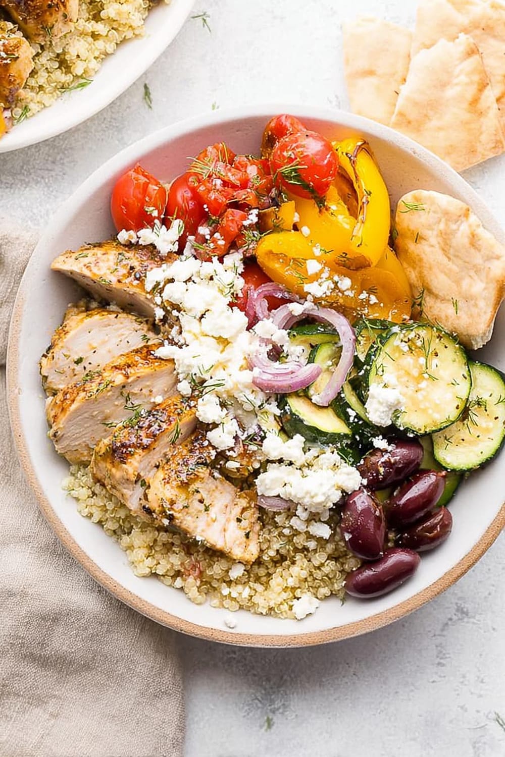 Picture tender, marinated chicken with that perfect char-kissed flavor sitting on a bed of fluffy quinoa, surrounded by roasted vegetables that smell like they came straight from a Greek taverna.