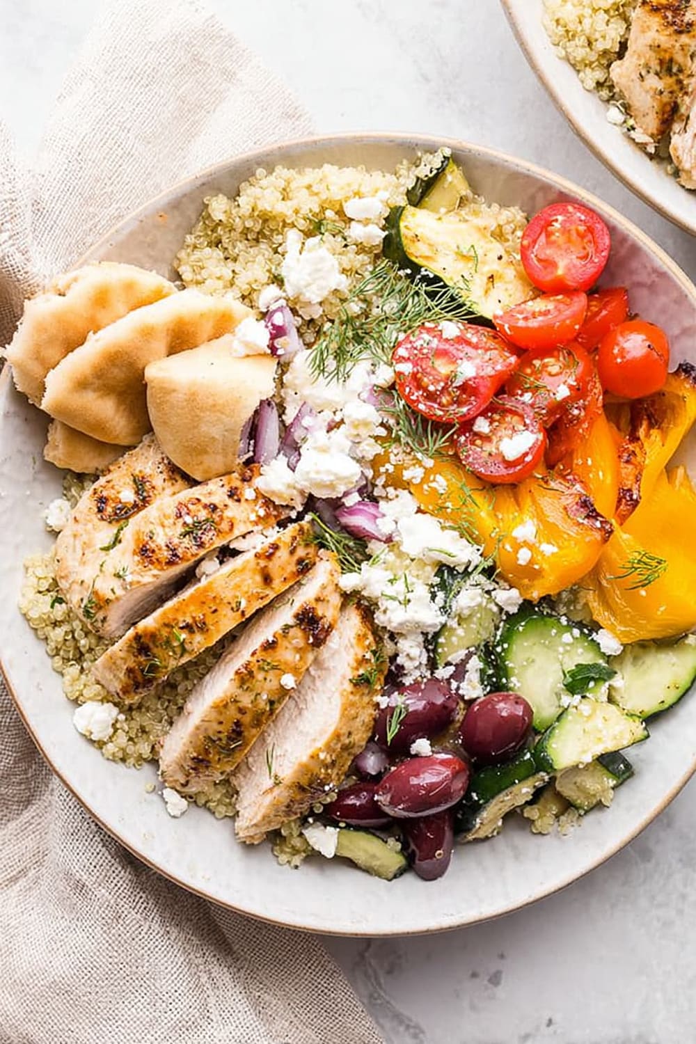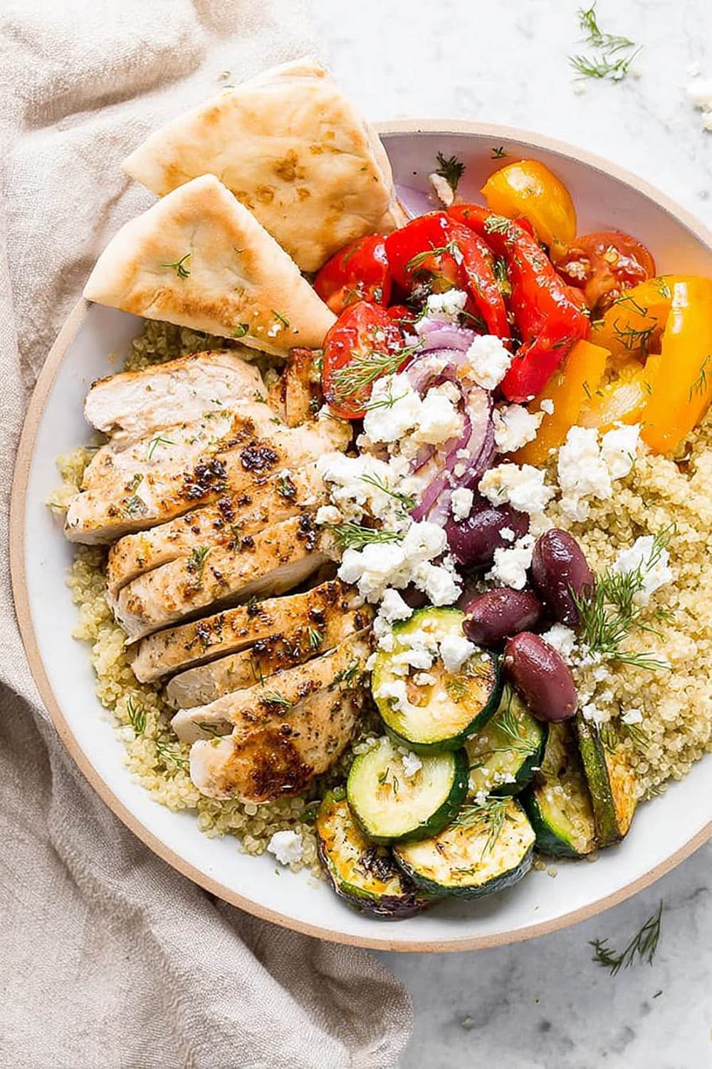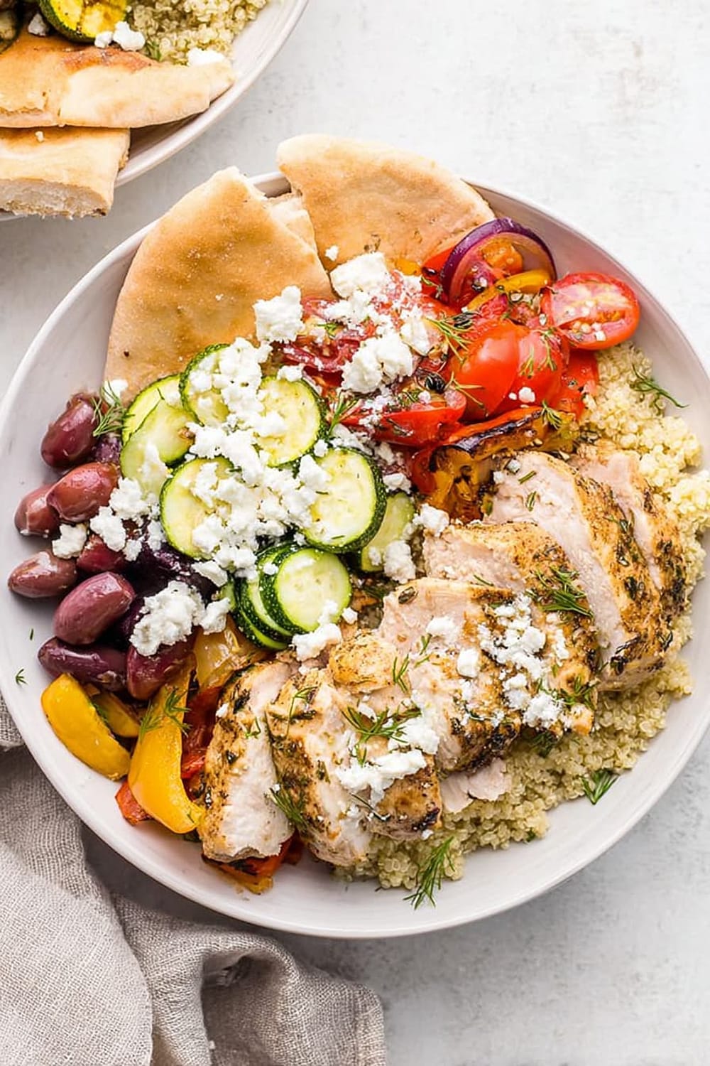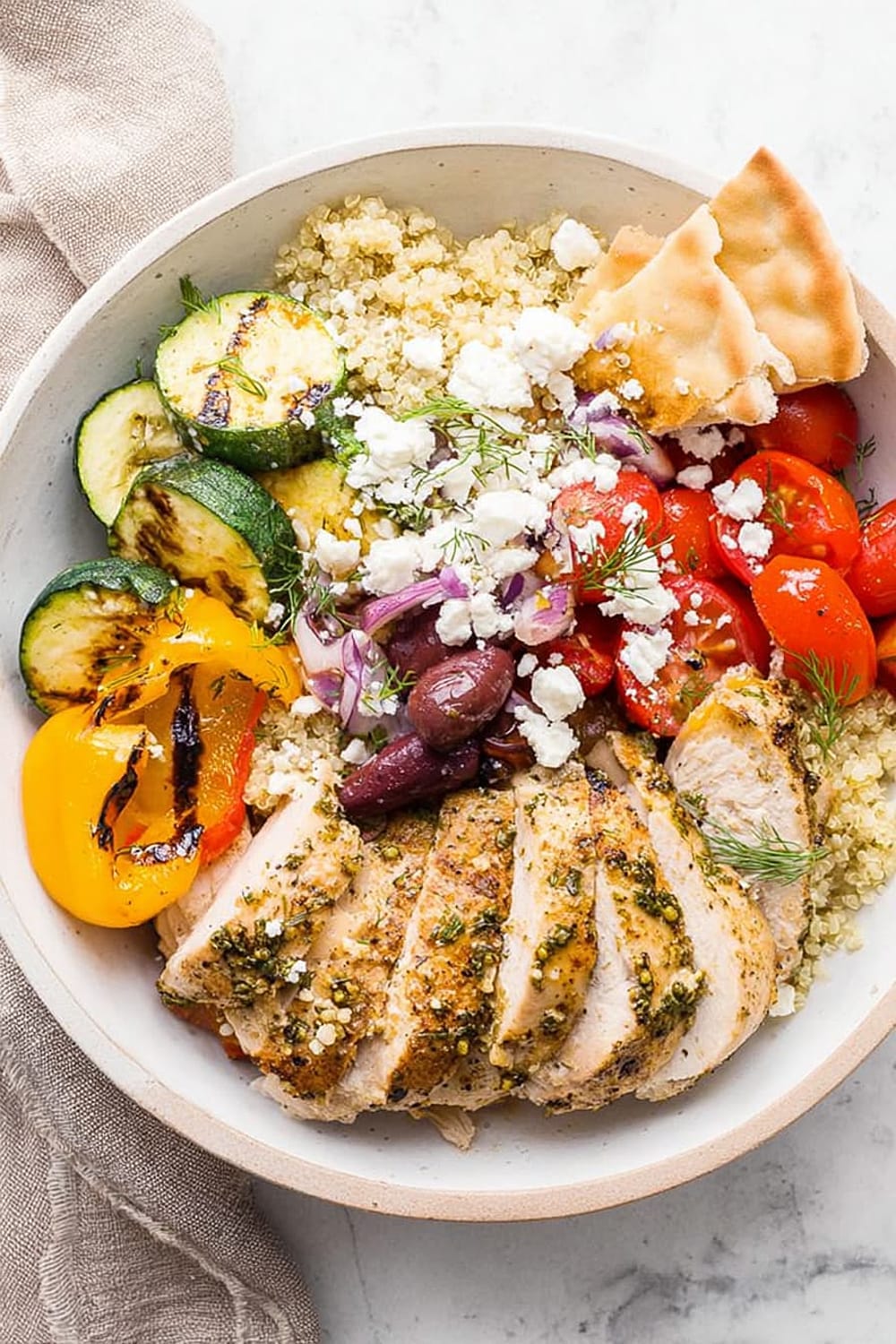 Picture tender, marinated chicken with that perfect char-kissed flavor sitting on a bed of fluffy quinoa, surrounded by roasted vegetables that smell like they came straight from a Greek taverna.