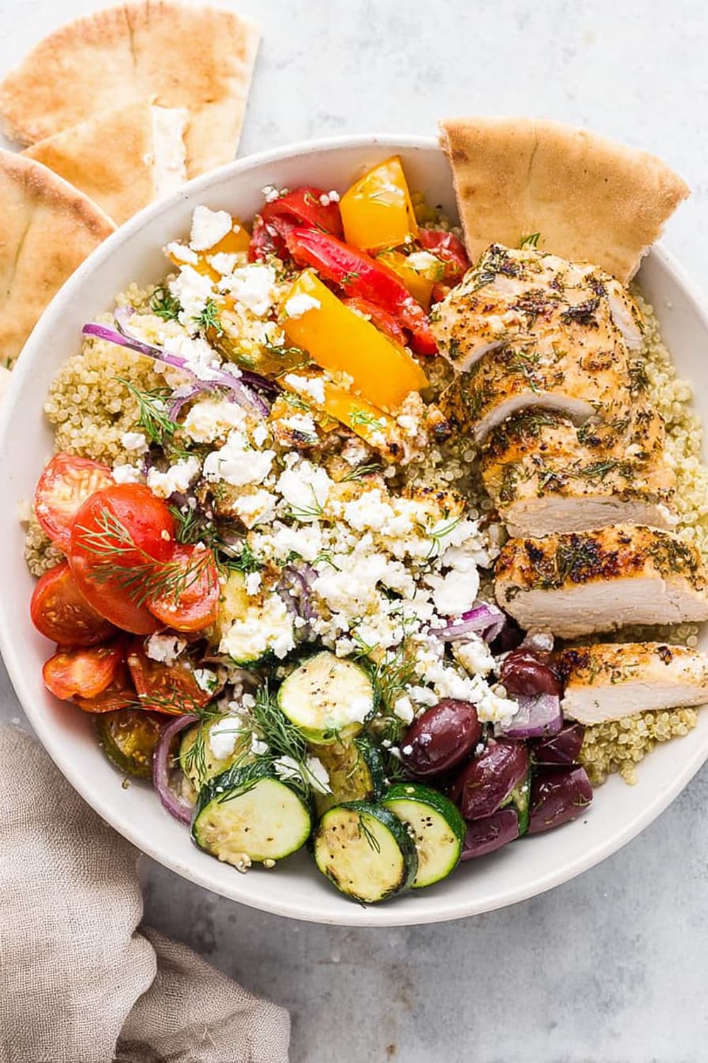 The chicken breast provides all nine essential amino acids, supporting muscle maintenance and satiety. Quinoa is a complete protein grain rich in magnesium, iron, and folate, making this bowl particularly nutritious. The colorful bell peppers and tomatoes are loaded with vitamin C and lycopene, powerful antioxidants that support immune function and heart health. Kalamata olives contribute monounsaturated fats and vitamin E, while feta cheese adds calcium and probiotics for bone and digestive health.
