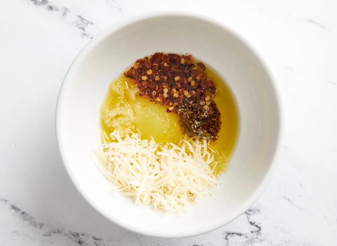 Mix olive oil, minced garlic, salt, pepper, chili flakes, and Parmesan in a bowl.