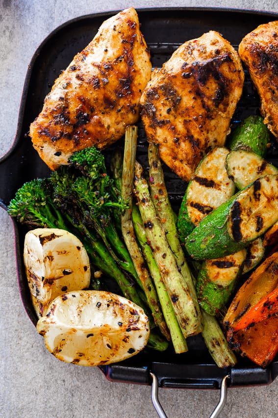 While the chicken rests, grill your vegetables. Cook them until they’re a bit charred and as tender as you prefer.