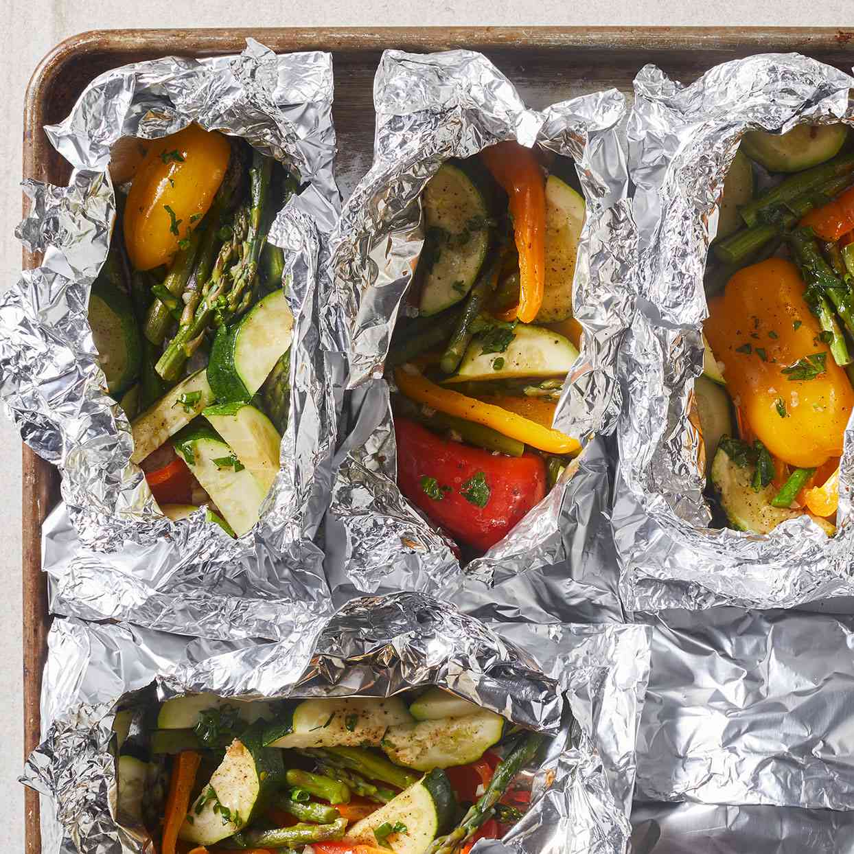 You can use a mix of your favorite veggies like asparagus, bell peppers, zucchini, and even potatoes. Toss them with some olive oil, garlic, salt, and pepper, then wrap them up in foil. Pop the packets on the grill or in the oven, and you’re all set.