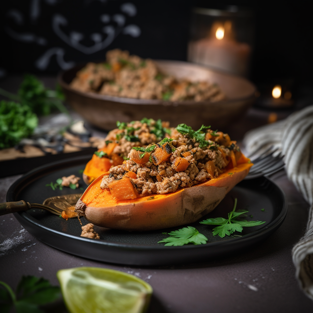 The sweet potato provides a starchy base, while the lean ground turkey offers plant-based protein for a complete meal.