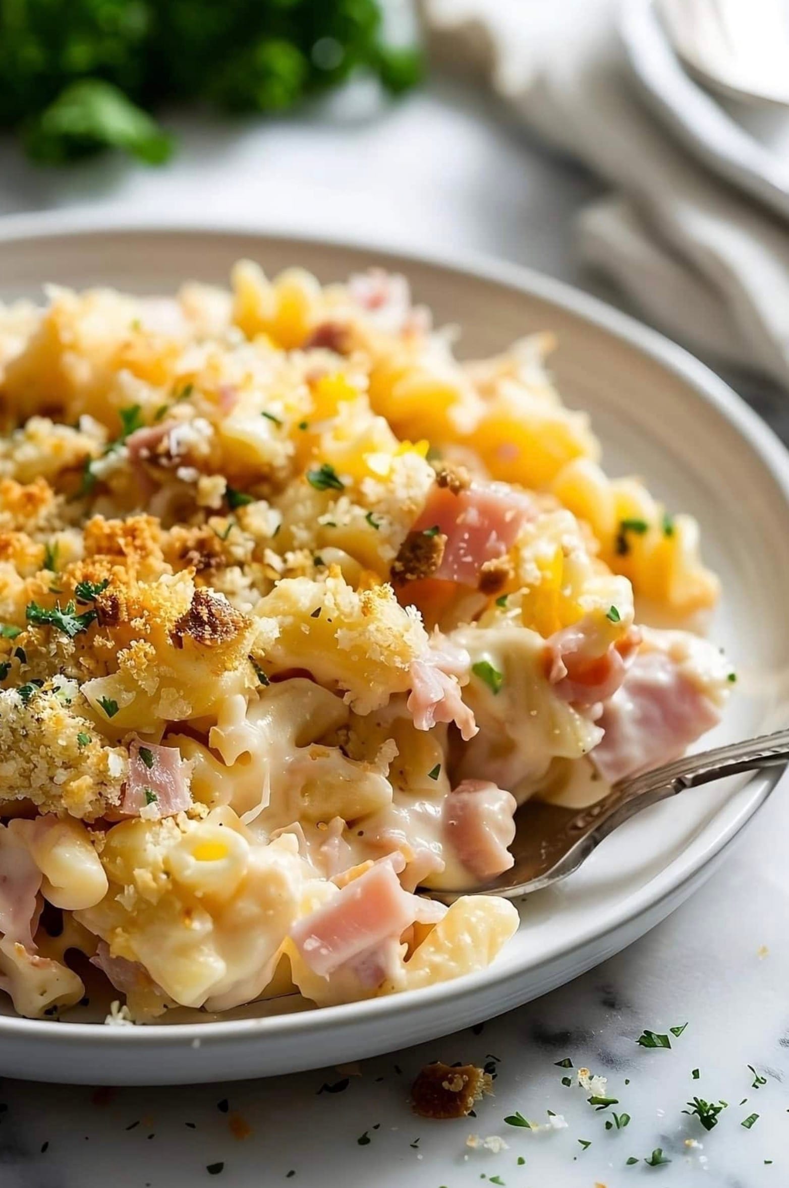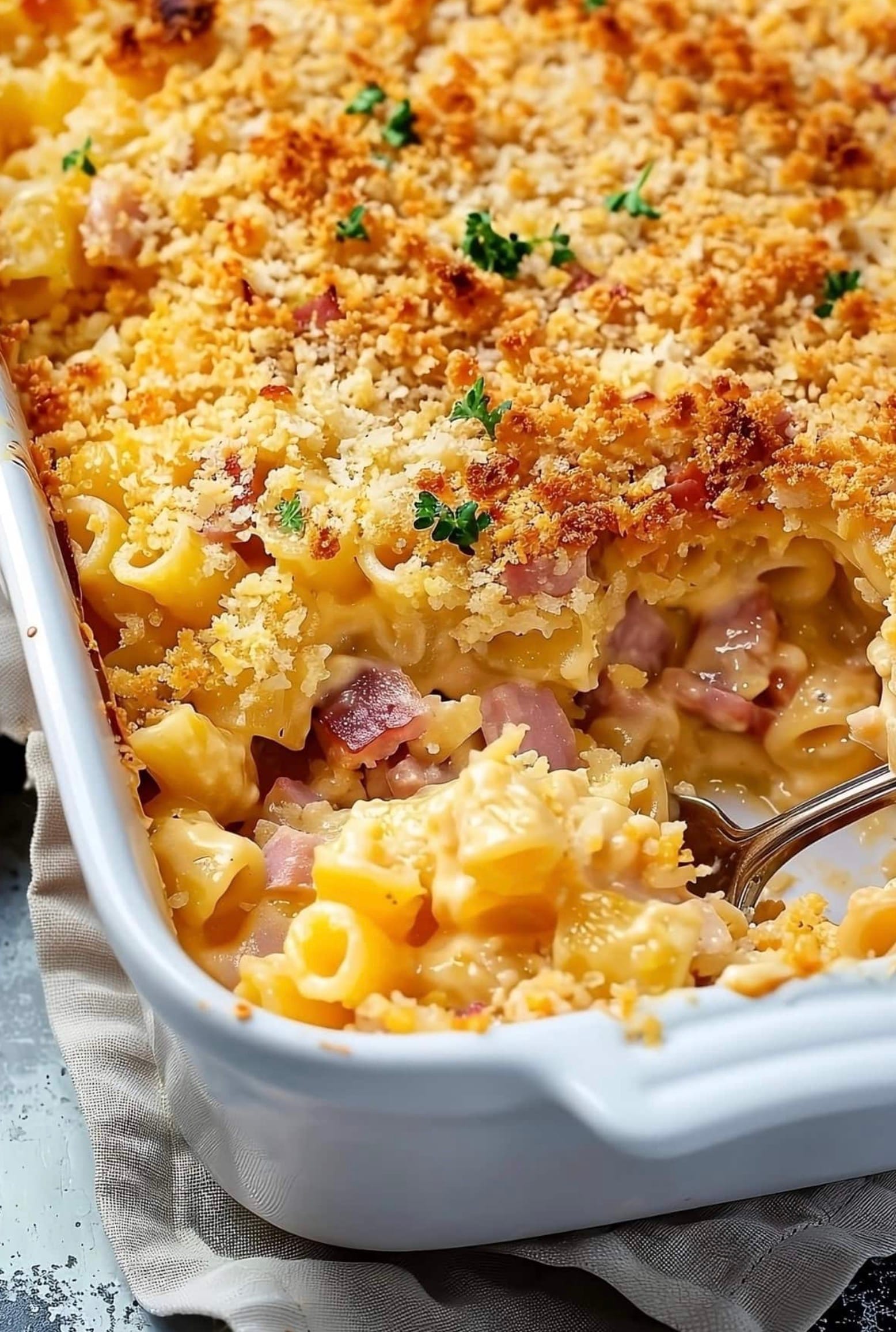 You’ll start by cooking pasta and making a cheese sauce. Then you mix in diced ham and pour it all into a baking dish. A crunchy breadcrumb topping adds the finishing touch before it goes in the oven. The result is a hot, cheesy casserole that’s sure to please kids and adults alike.