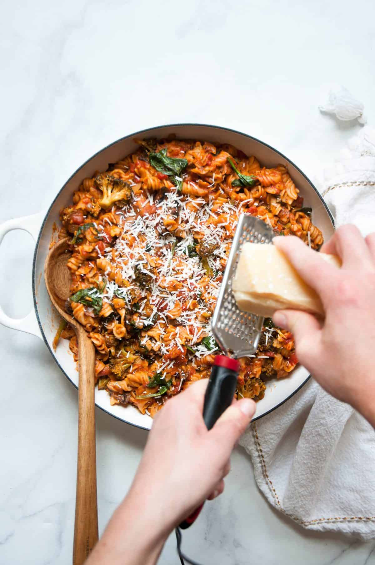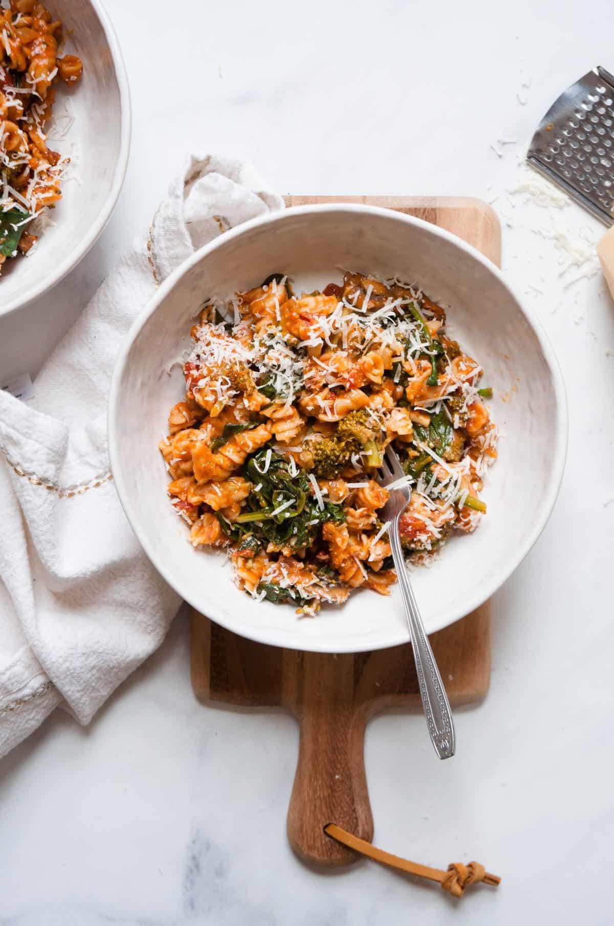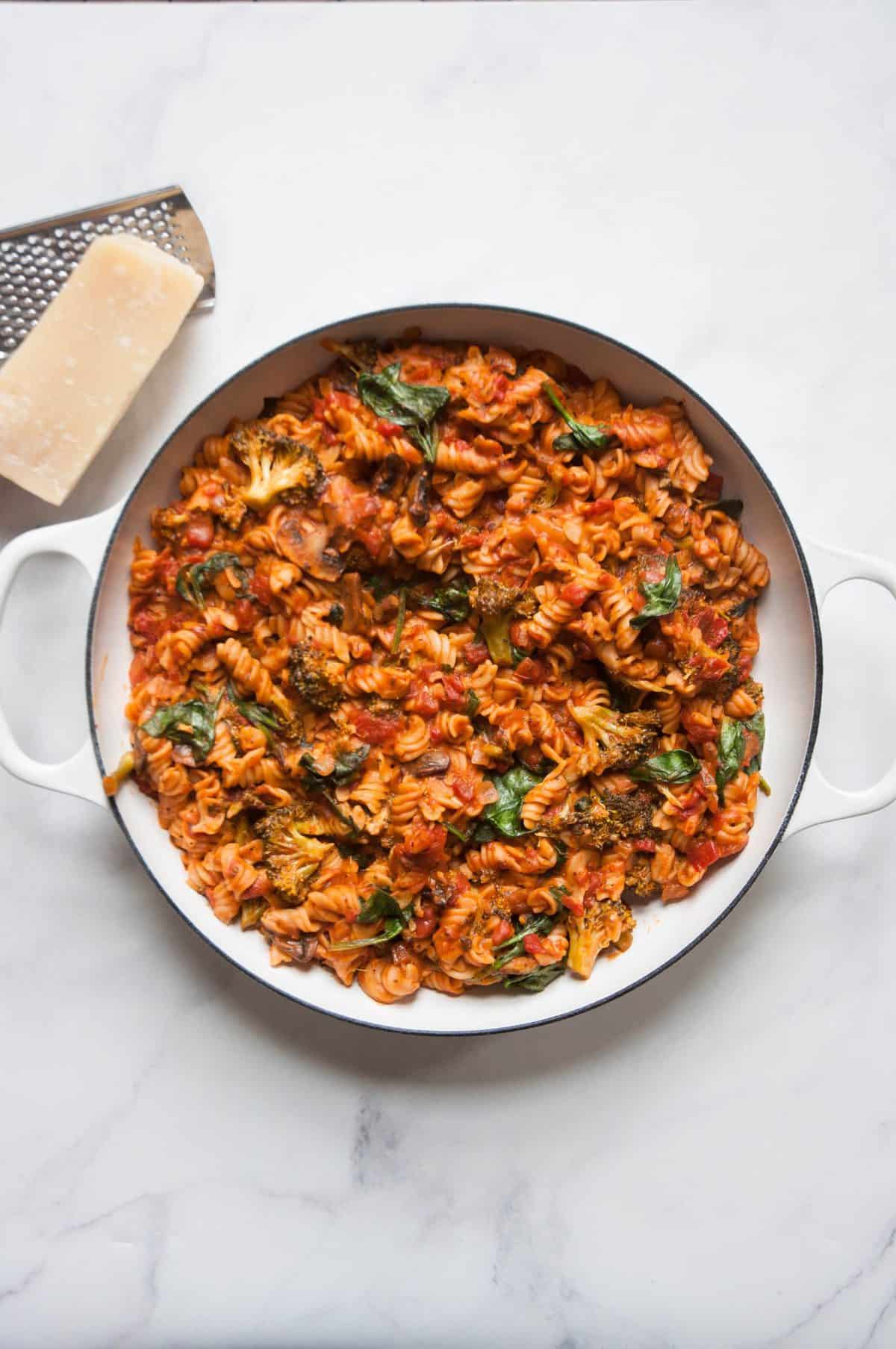 You can easily swap ingredients in this one-pot pasta to suit your tastes or use what’s in your pantry. Try whole wheat pasta instead of brown rice fusilli for extra fiber.