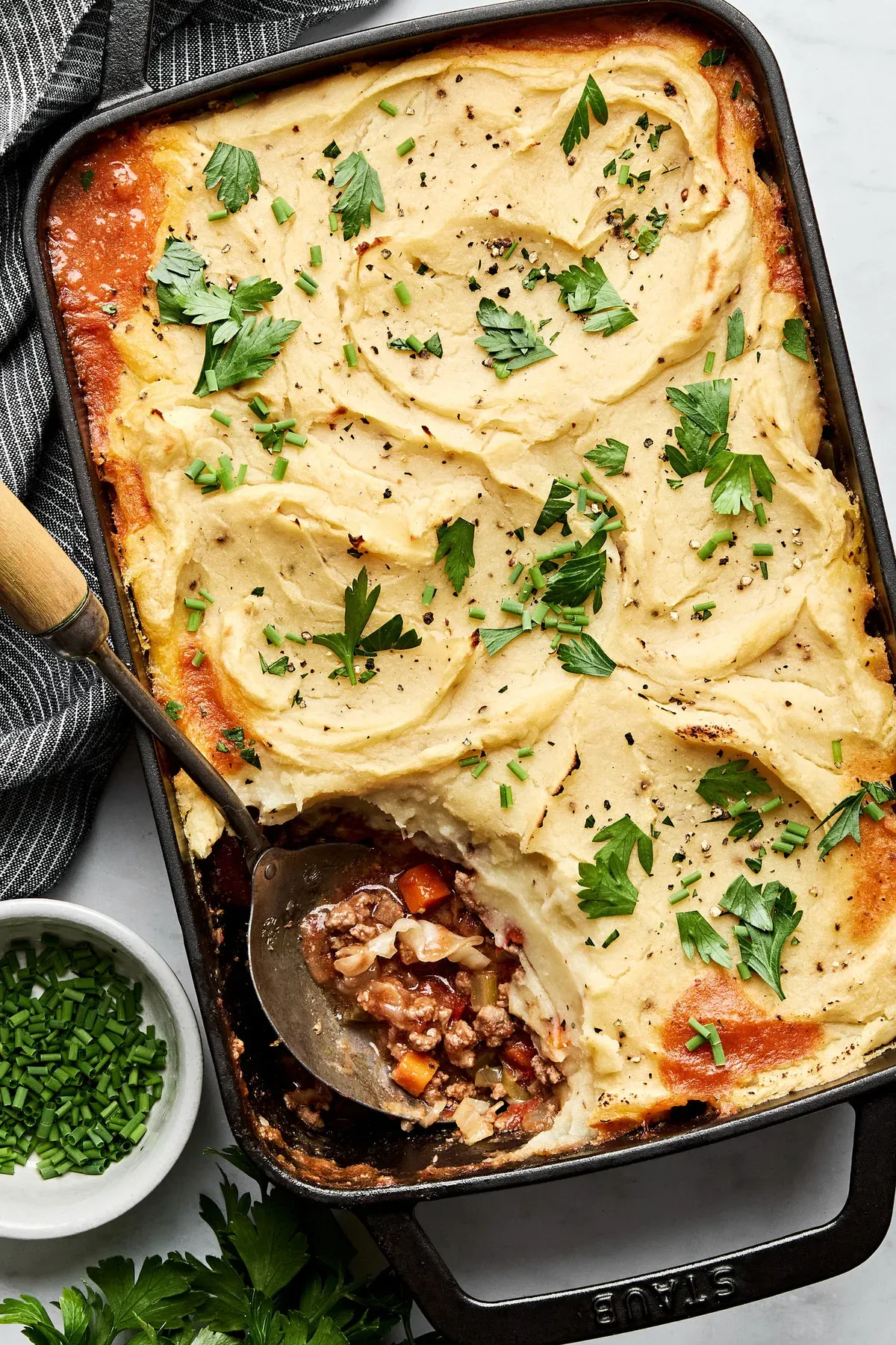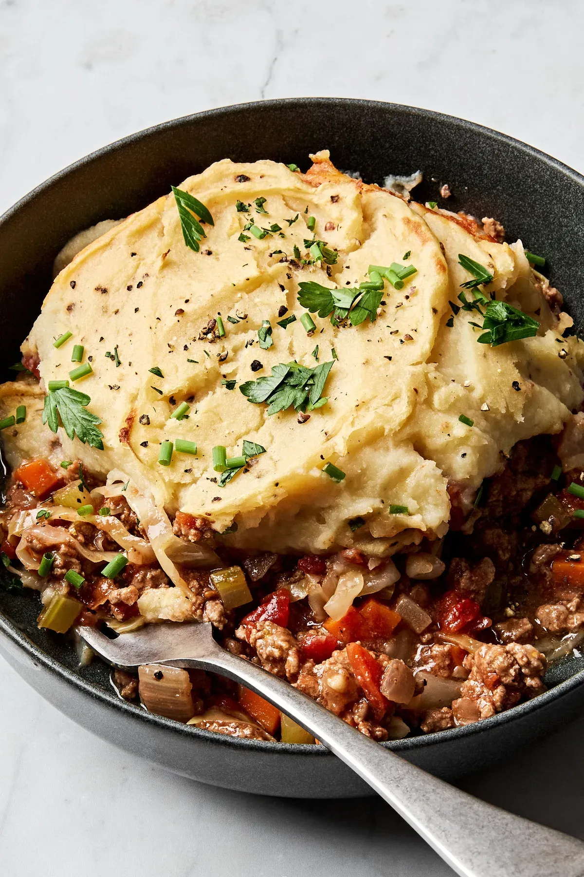 You can make this shepherd’s pie ahead of time. Just assemble it, cover tightly, and keep in the fridge for up to 2 days before baking.