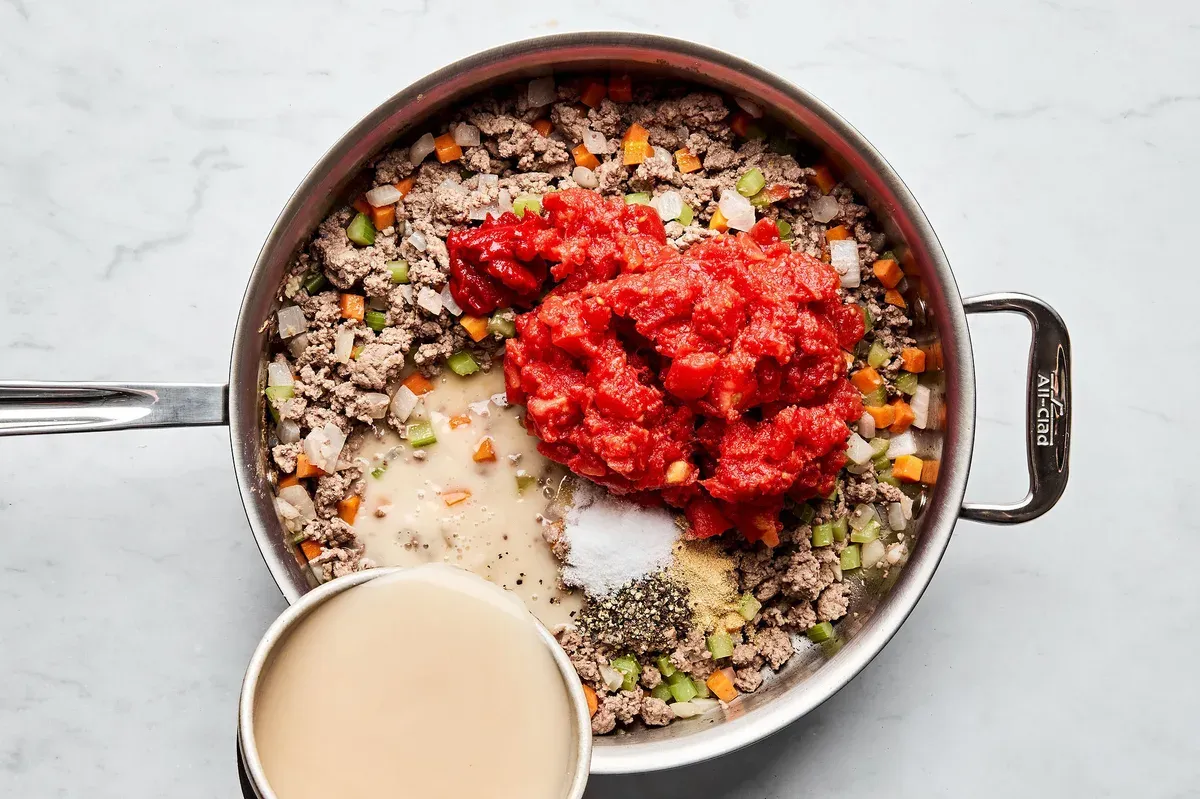 Next, mix 2 cups of chicken stock with cornstarch in a small bowl. Pour this into your beef mixture. Add tomatoes, tomato paste, Worcestershire sauce, and seasonings. Stir well.