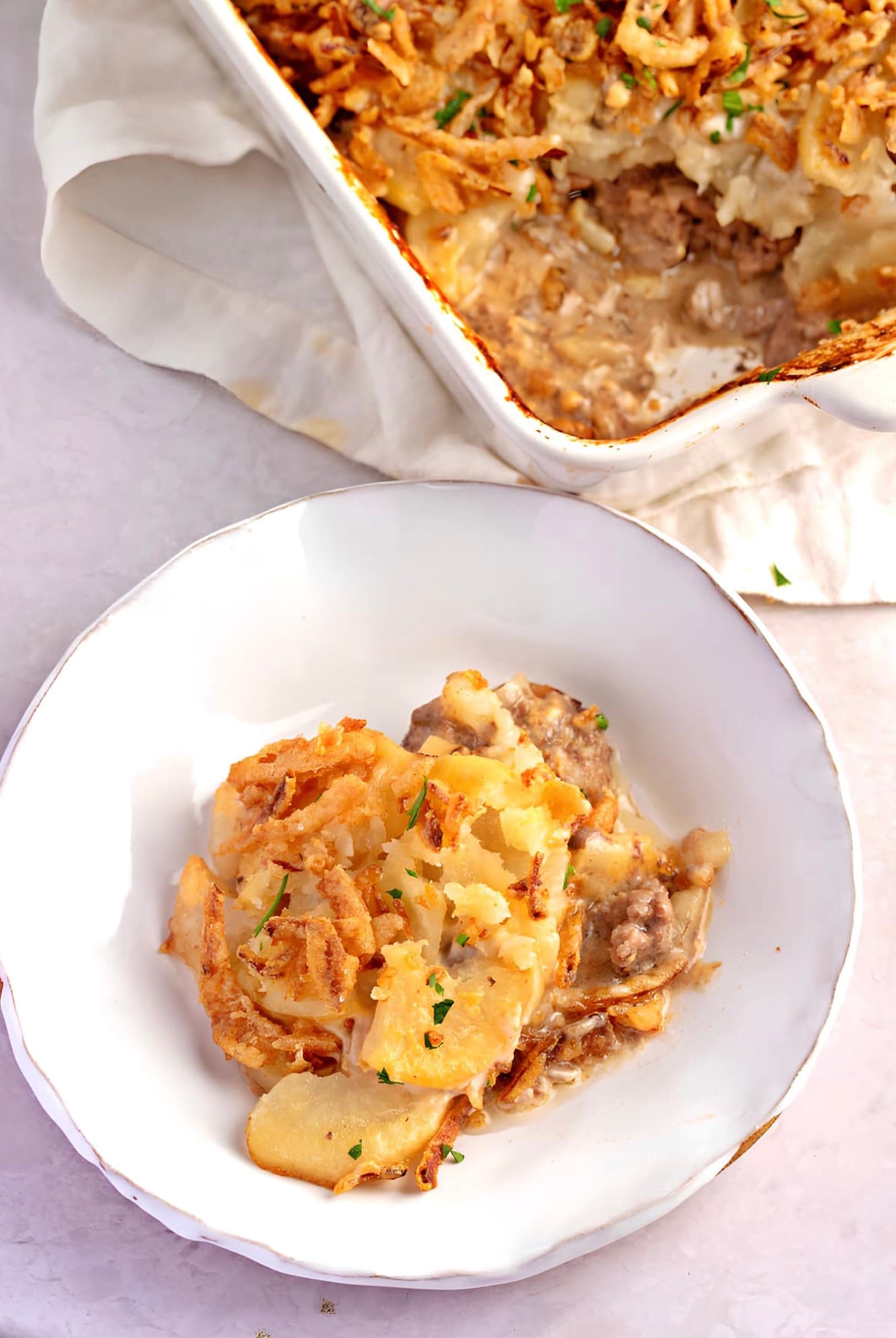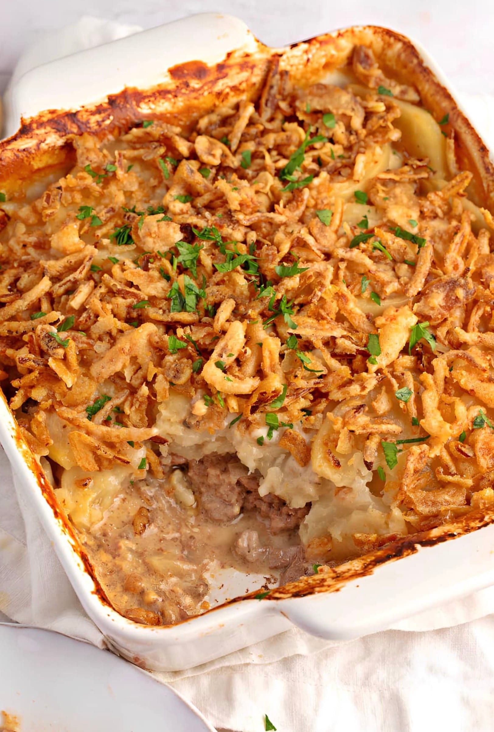 Try swapping the French-fried onions with crushed potato chips or breadcrumbs for a crunchy topping. You can also add veggies like peas, carrots, or corn for extra nutrition and color.