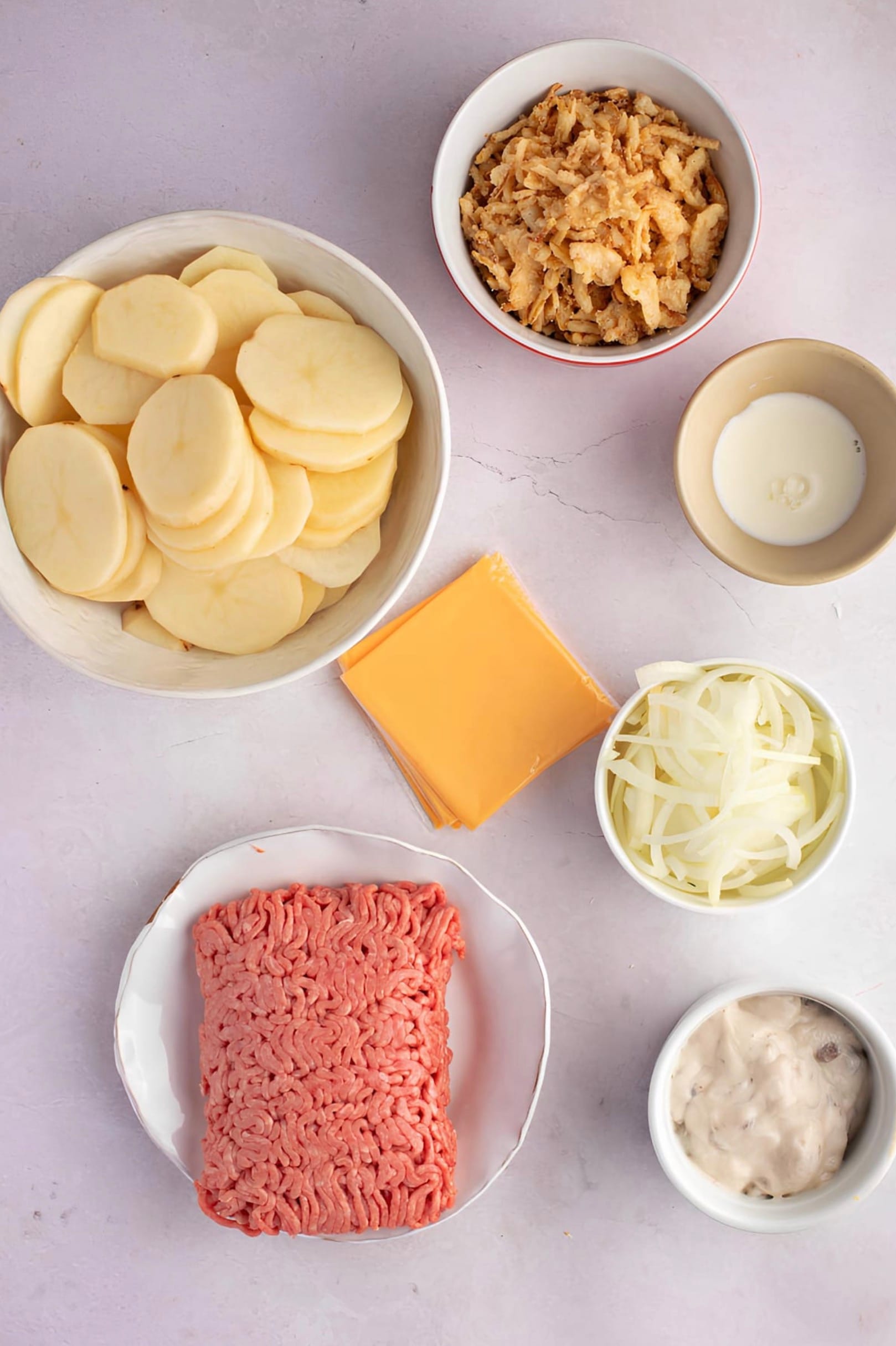 Start layering your ingredients. Put the ground beef on the bottom. Next, add the sliced onion and potatoes. Top it off with the cheese slices.