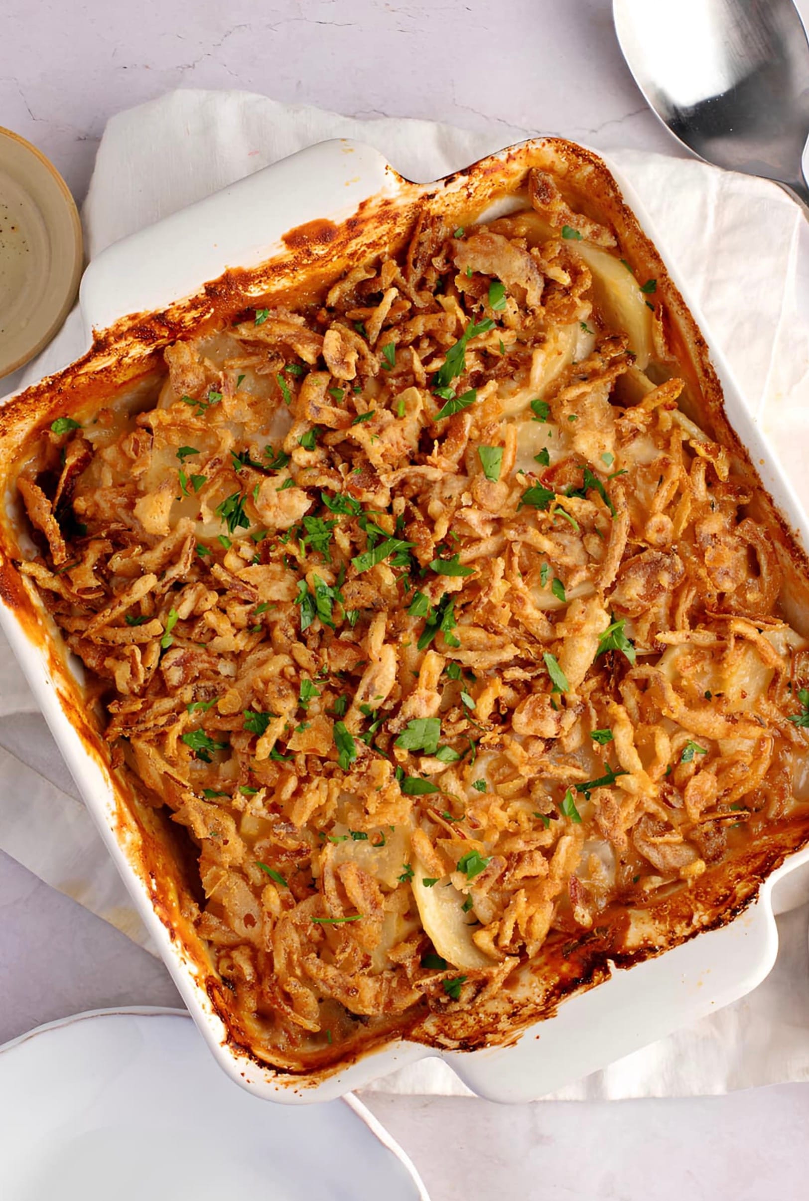 The French-fried onions add a nice crunch on top. You can find them in most grocery stores near the canned vegetables.