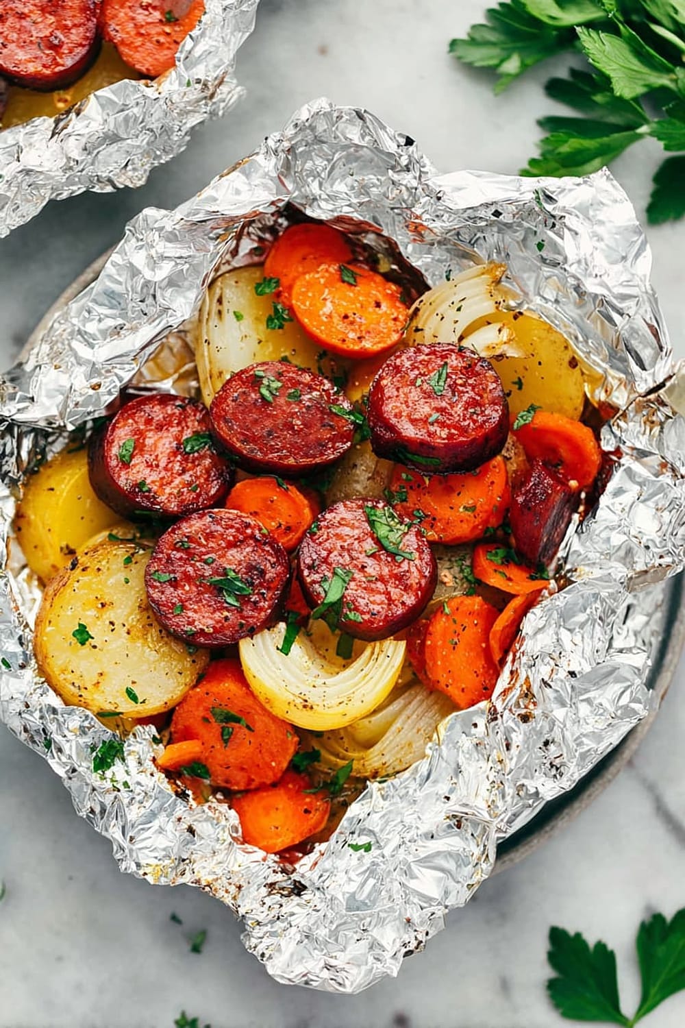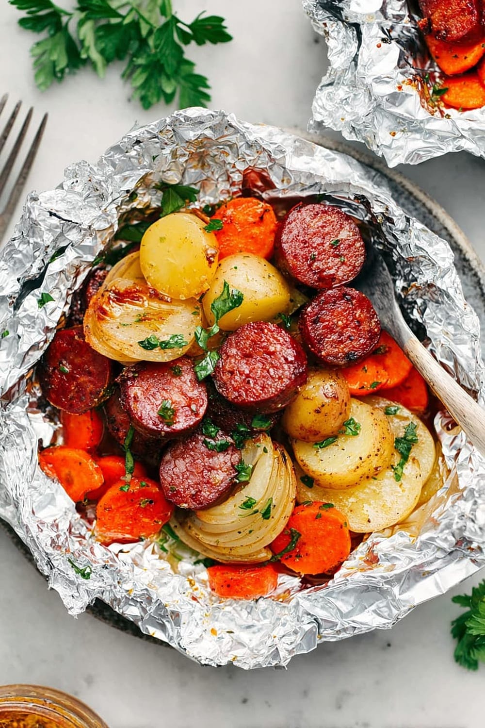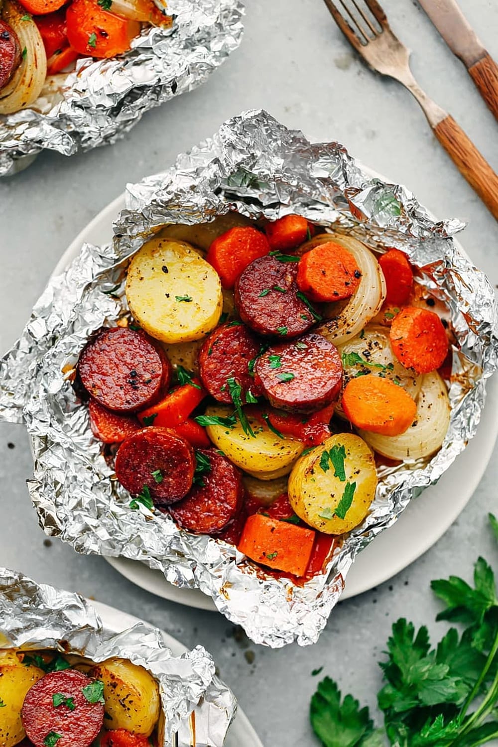 Each foil packet provides approximately 380-420 calories with a balanced mix of protein from the sausage, complex carbohydrates from the potatoes, and essential nutrients from the colorful vegetables. The recipe delivers about 18-20 grams of protein per serving, making it a satisfying complete meal that keeps you full for hours.