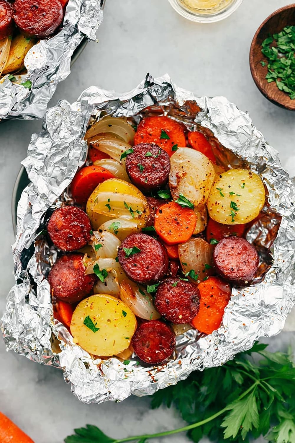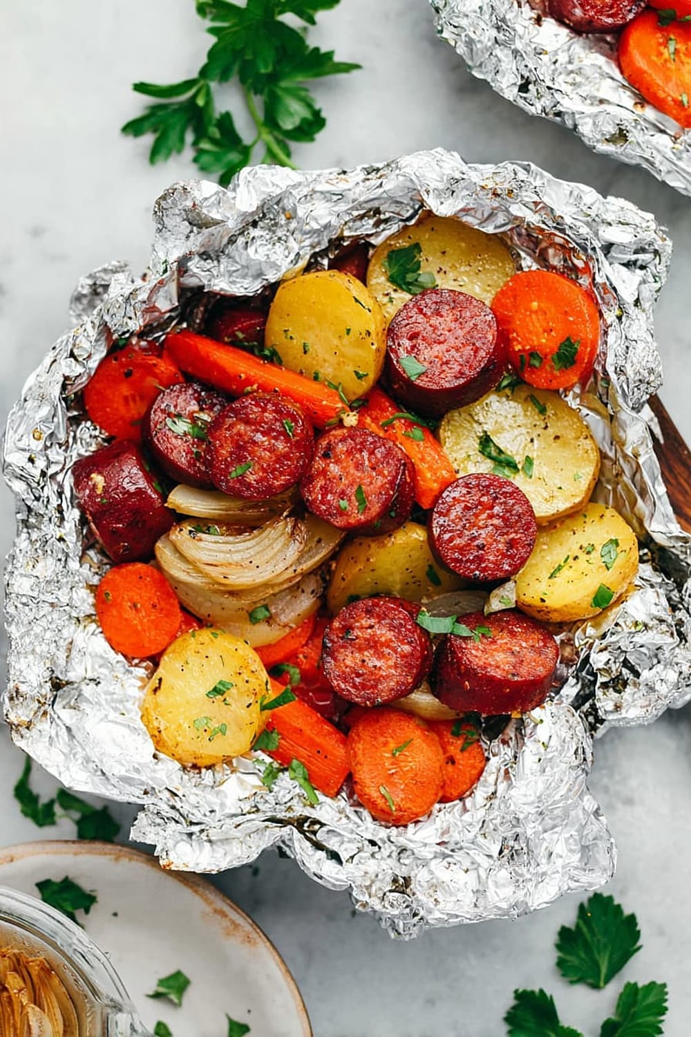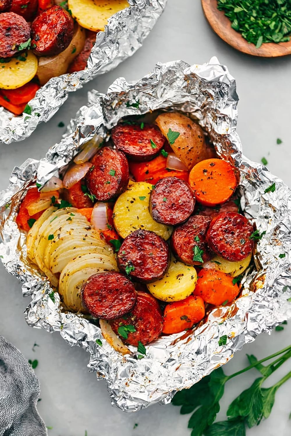 Each foil packet provides approximately 380-420 calories with a balanced mix of protein from the sausage, complex carbohydrates from the potatoes, and essential nutrients from the colorful vegetables. The recipe delivers about 18-20 grams of protein per serving, making it a satisfying complete meal that keeps you full for hours.