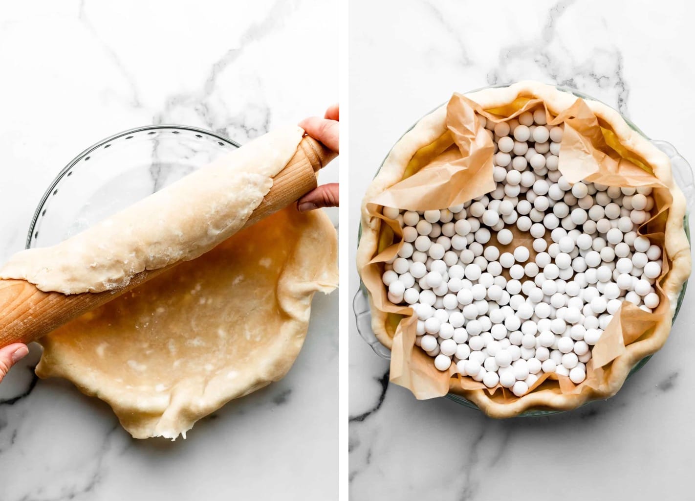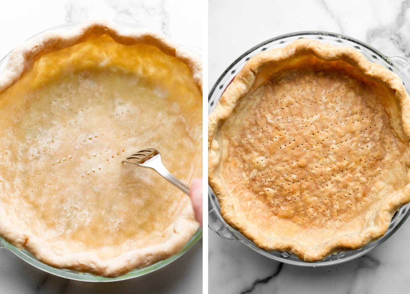 Preheat your oven to 375°F (190°C). Line the chilled crust with parchment and fill with pie weights. Bake for 15-16 minutes, then remove the weights and parchment. Prick the bottom with a fork and bake for another 14-15 minutes until browned.