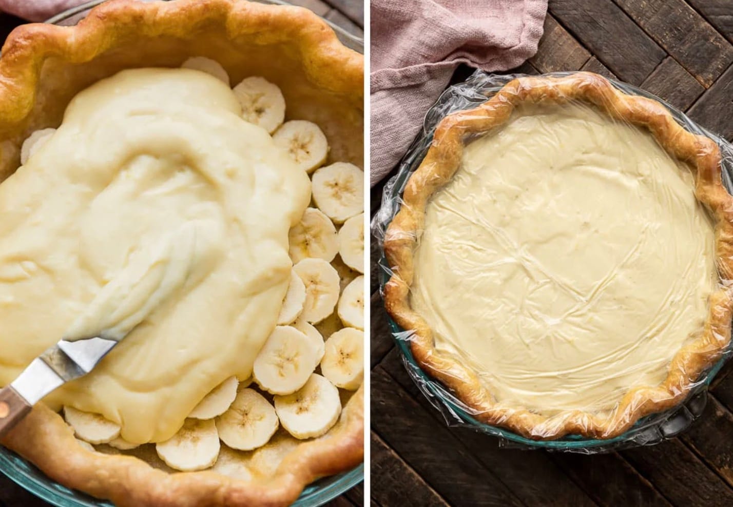 Slice bananas into the cooled crust, then spread the custard on top. Cover with plastic wrap and chill for at least 4 hours.