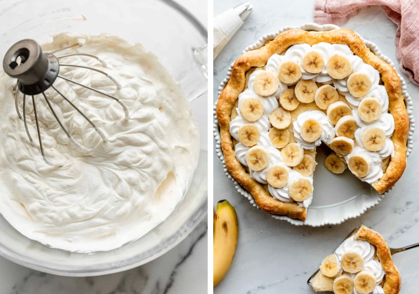 When ready to serve, whip the cream, sugar, and vanilla until medium peaks form. Spread or pipe onto the pie. Garnish with fresh banana slices just before serving.
