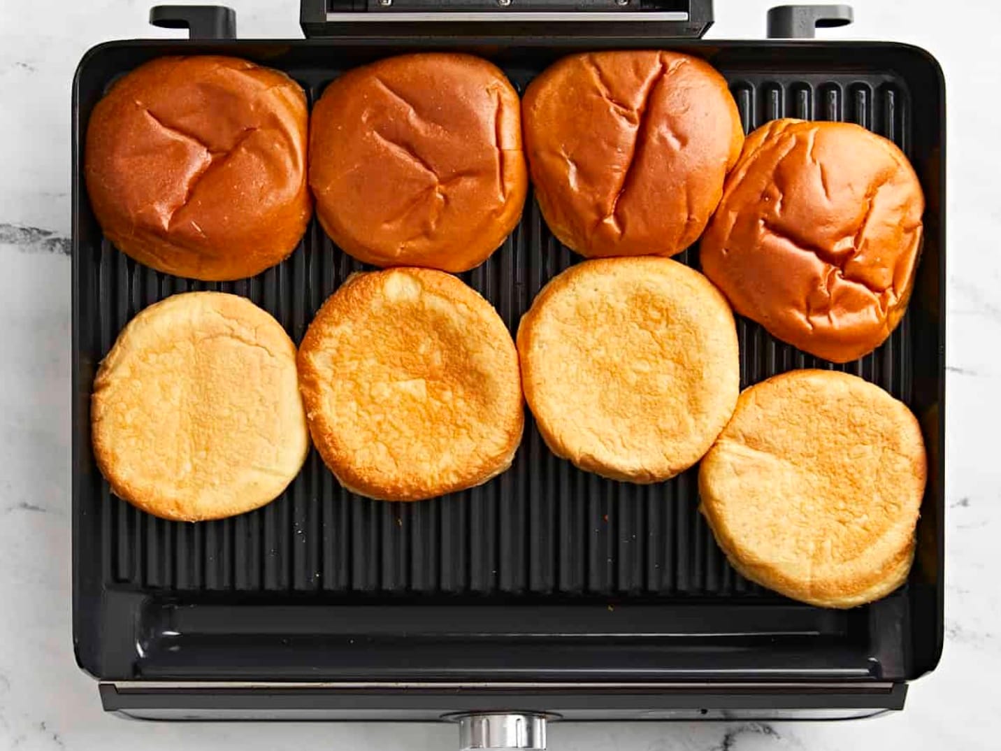 Preheat your indoor grill to 325°F. Spread soft butter on the cut sides of the buns. Toast them on the grill until golden brown. Set aside.