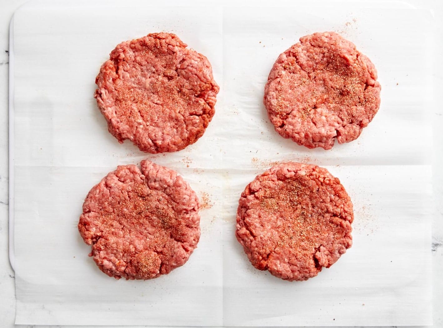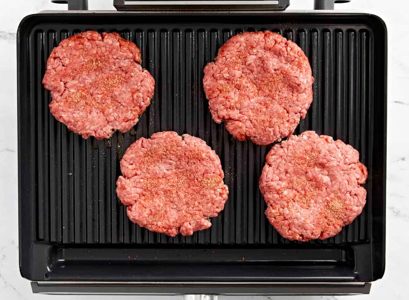 Mix the burger seasoning spices in a small bowl. Divide 1 pound of ground beef into 4 equal parts. Shape each part into a patty about 1/2 to 1 inch thick. Don’t press too hard.