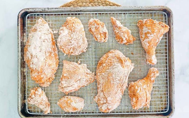 Set up a wire rack on a baking sheet. Coat each chicken piece in the flour mixture, shaking off excess. Place on the rack.