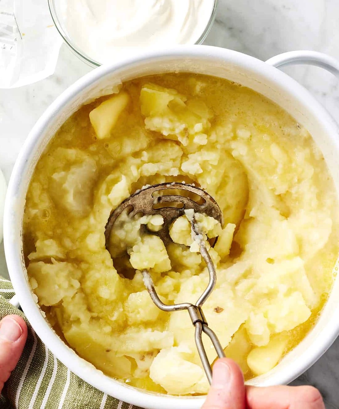 Keep mashing until you like how smooth they are. If you want, mix in 1/4 to 1/2 cup sour cream with a spoon.