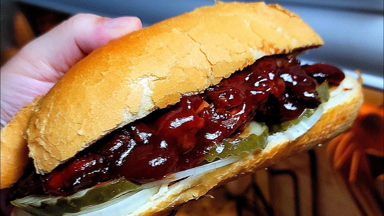 This homemade version of the famous McRib sandwich features tender, slow-cooked baby back ribs slathered in barbecue sauce.