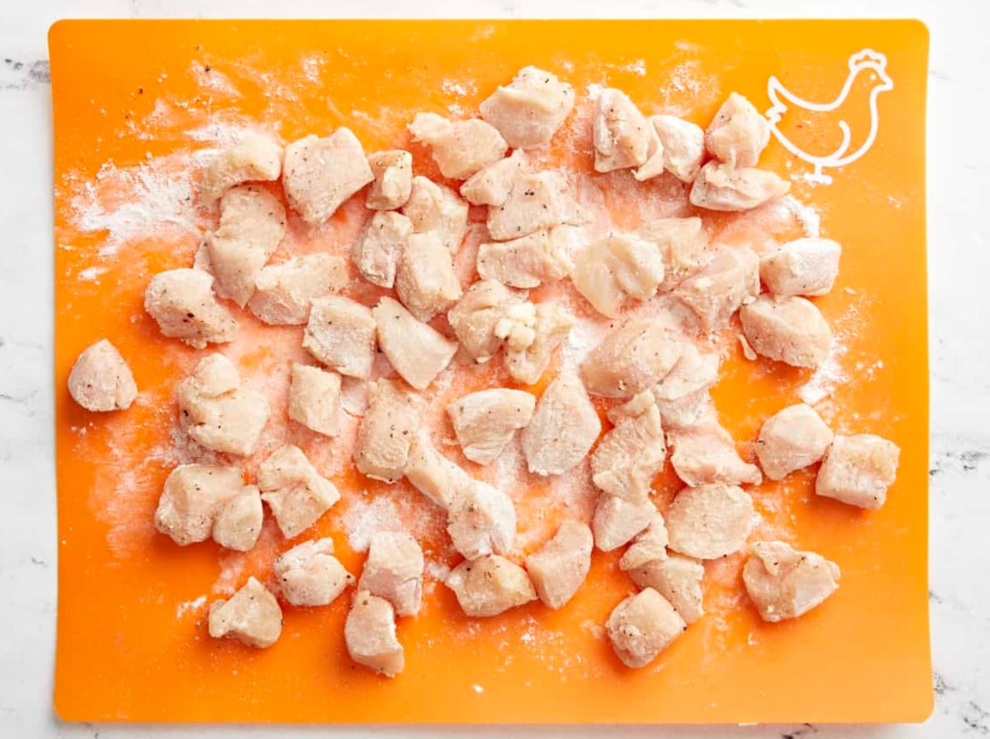 Cut chicken into 1/2 inch pieces. Season with salt, pepper, and garlic powder. Coat in flour.