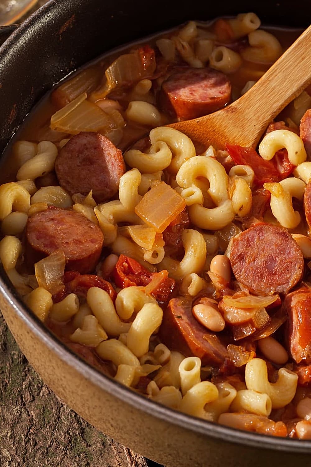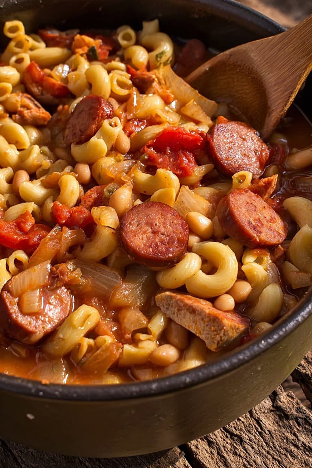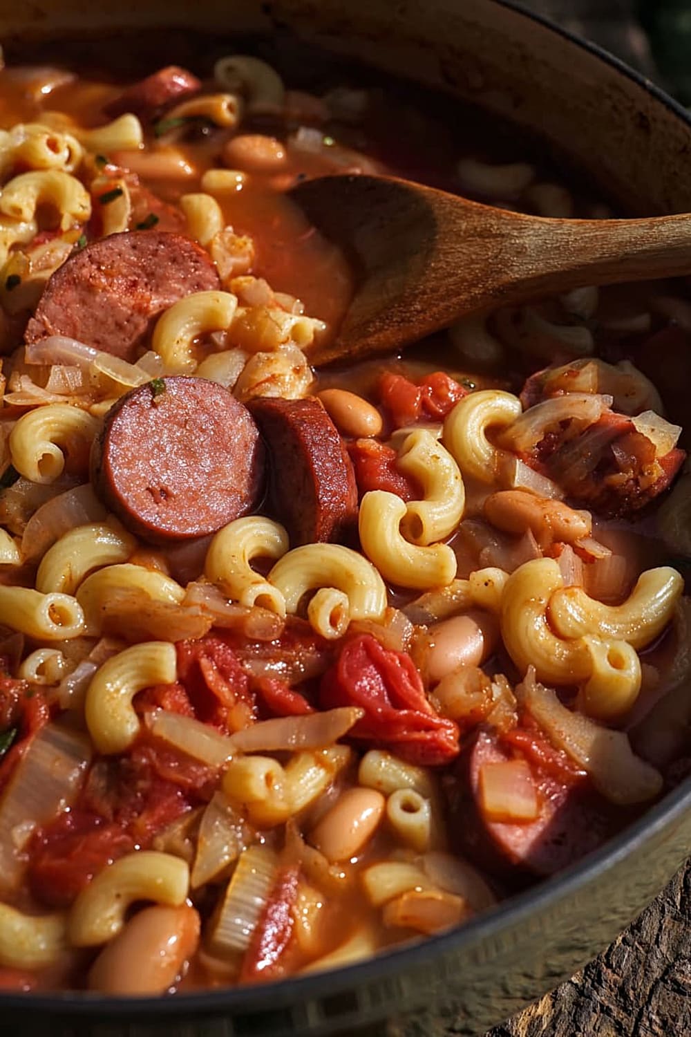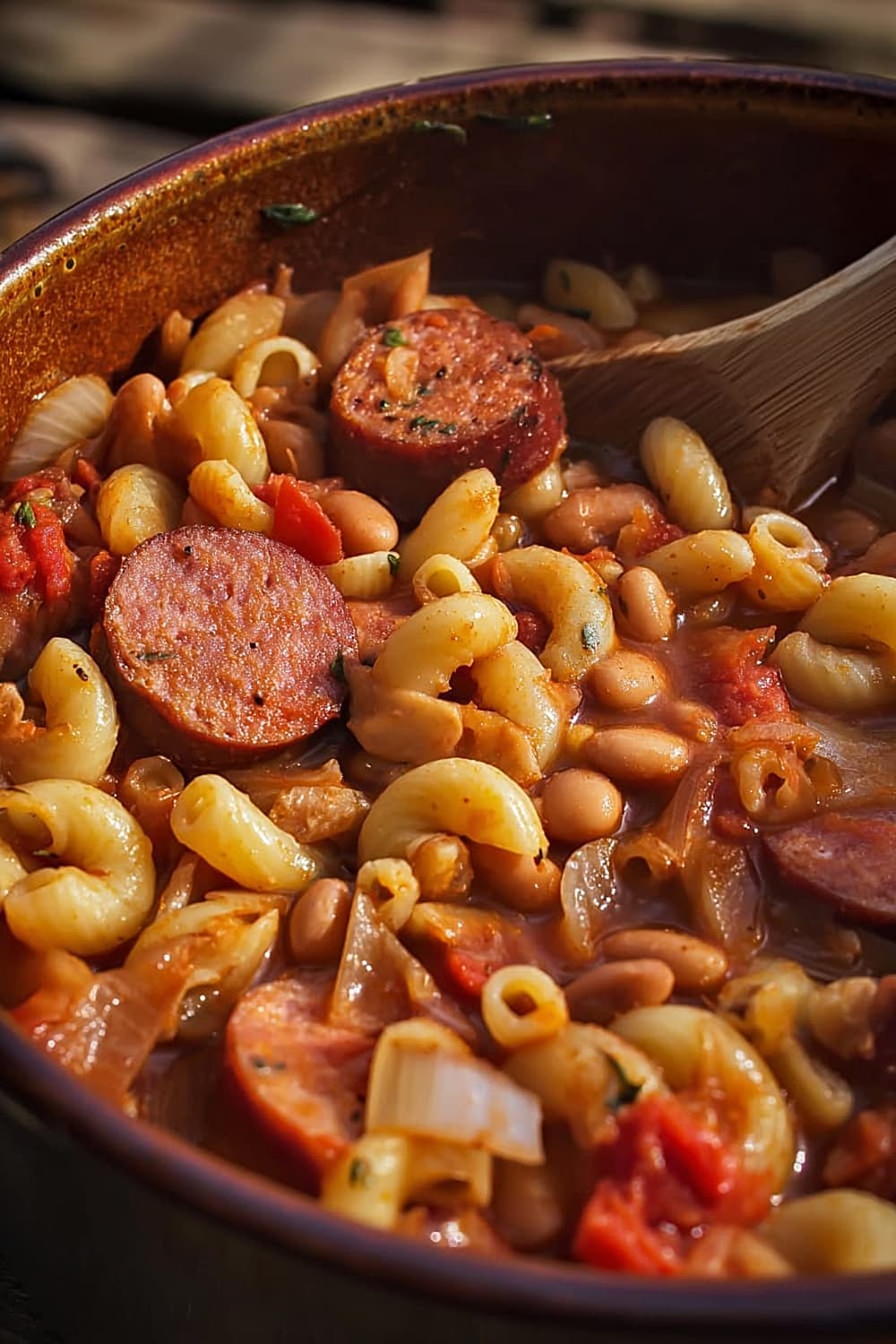 Picture this: tender elbow macaroni swimming alongside smoky kielbasa, hearty pinto beans, and rich stewed tomatoes, all mingling together in perfect harmony.