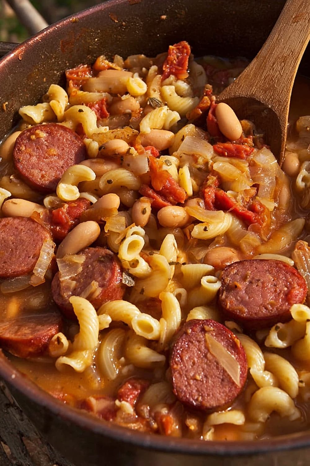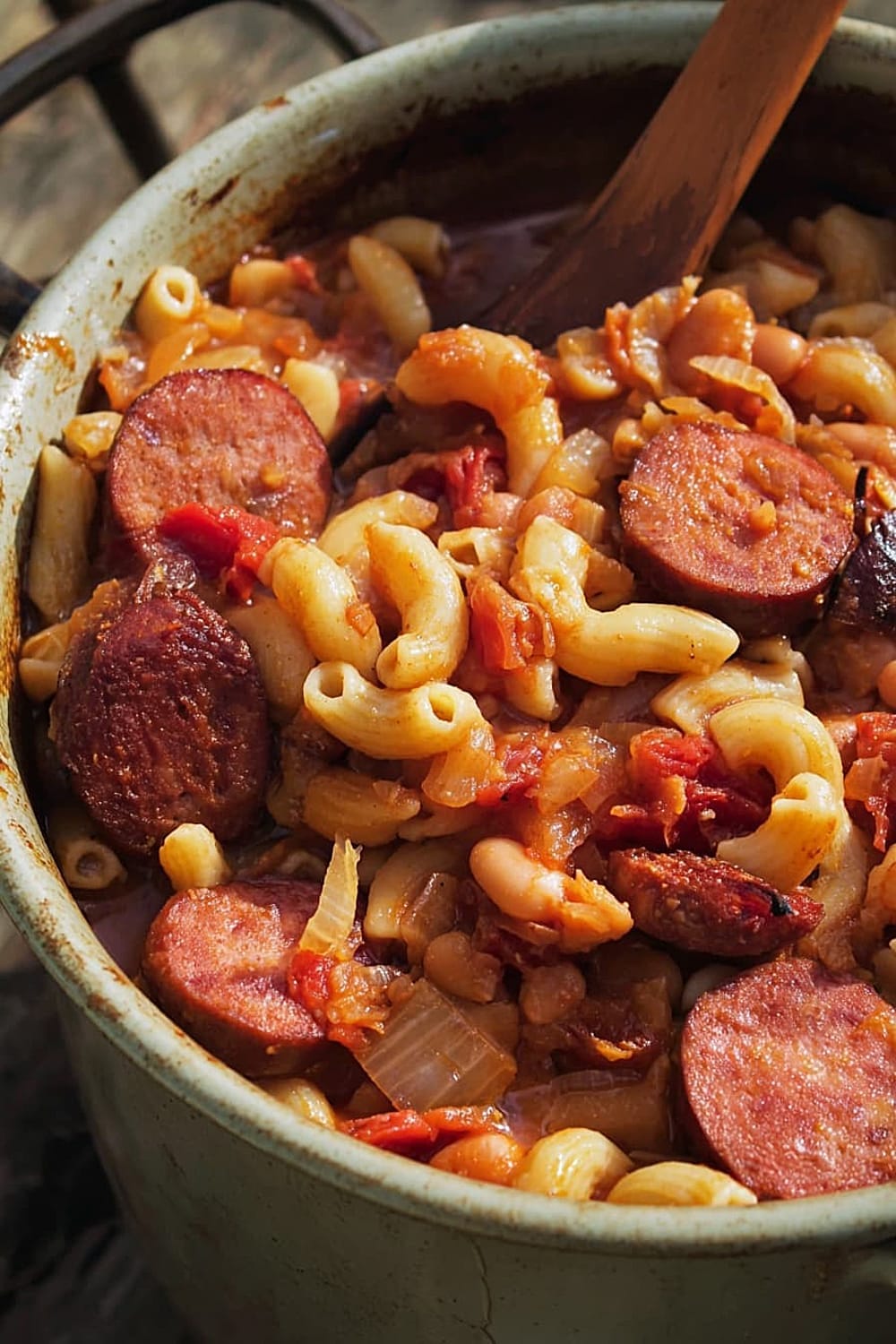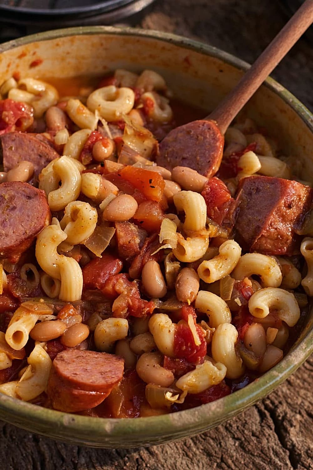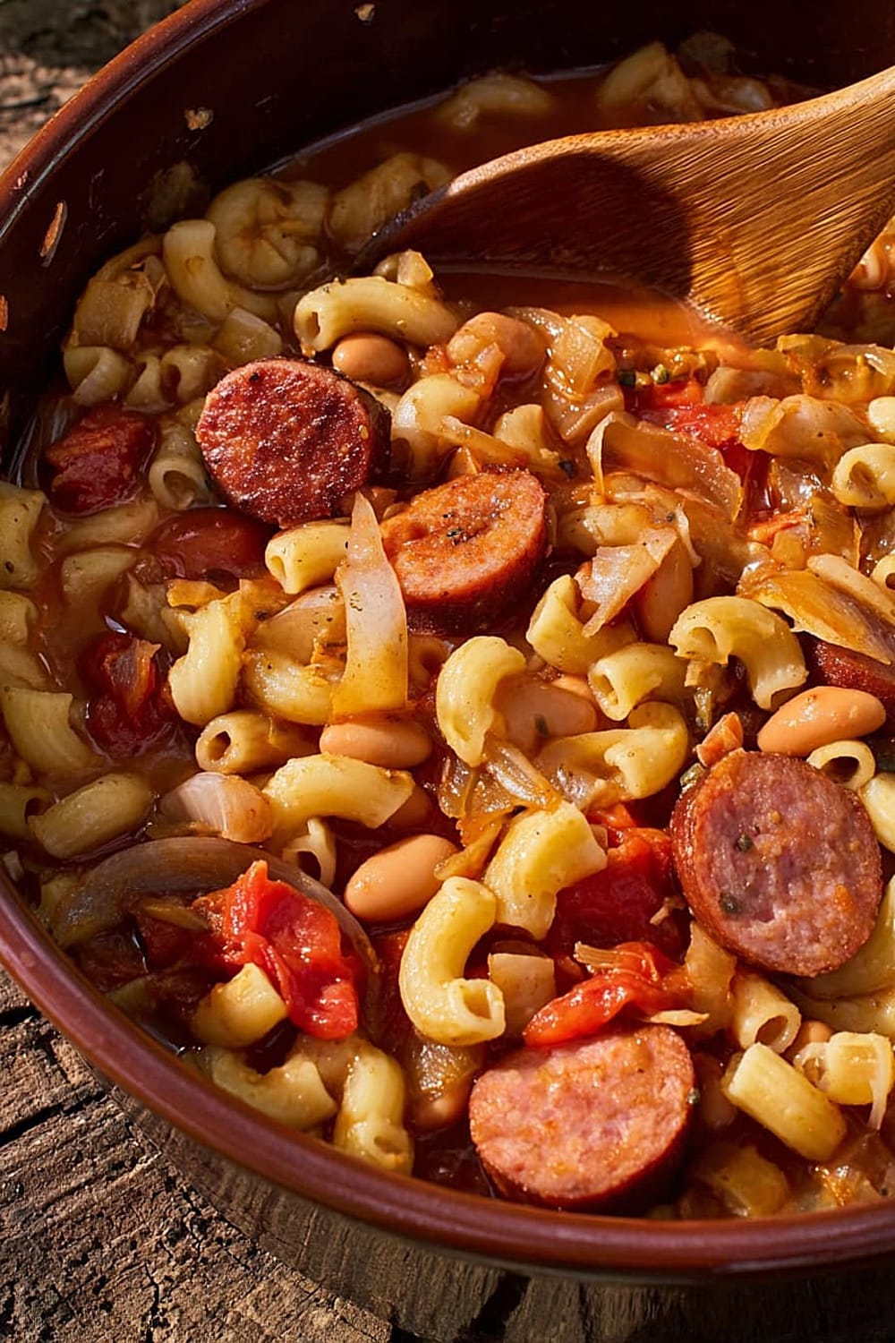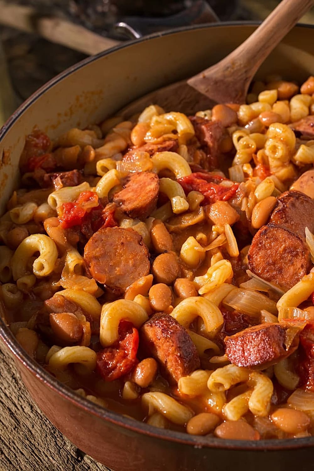 Picture this: tender elbow macaroni swimming alongside smoky kielbasa, hearty pinto beans, and rich stewed tomatoes, all mingling together in perfect harmony.