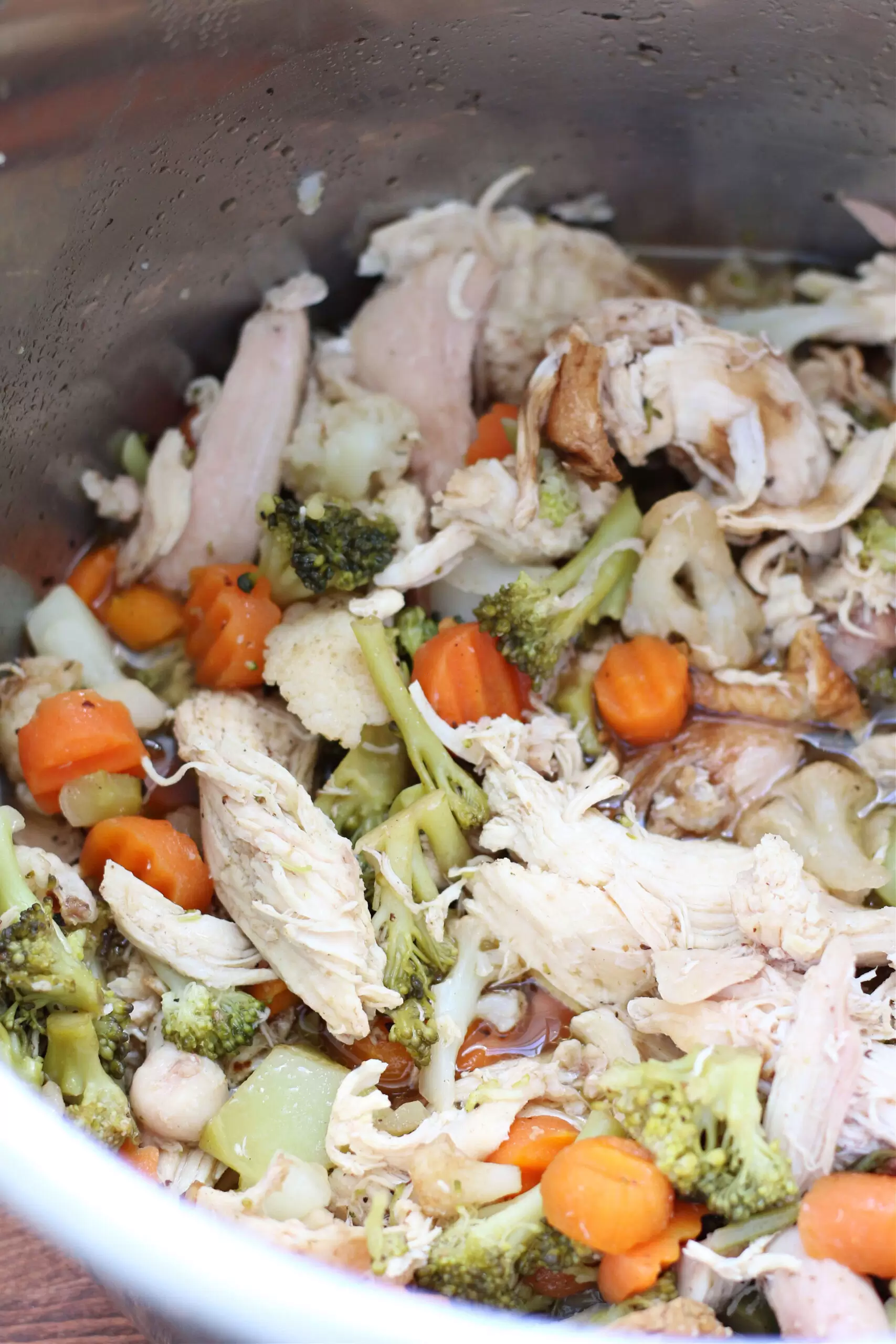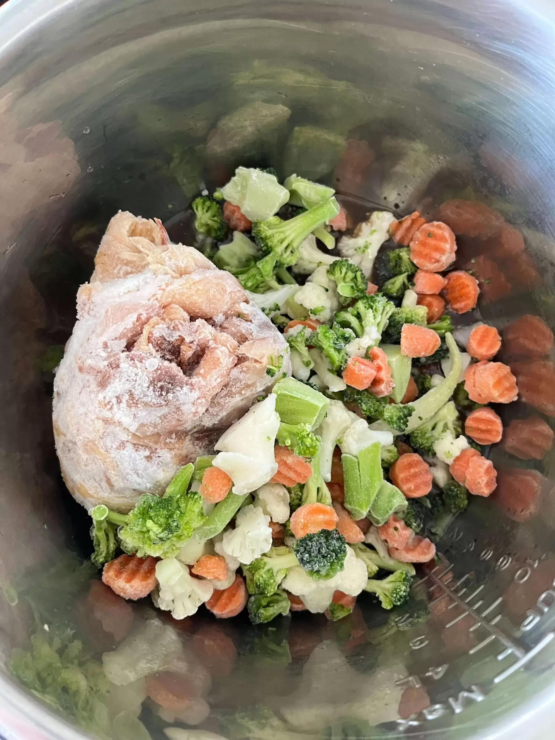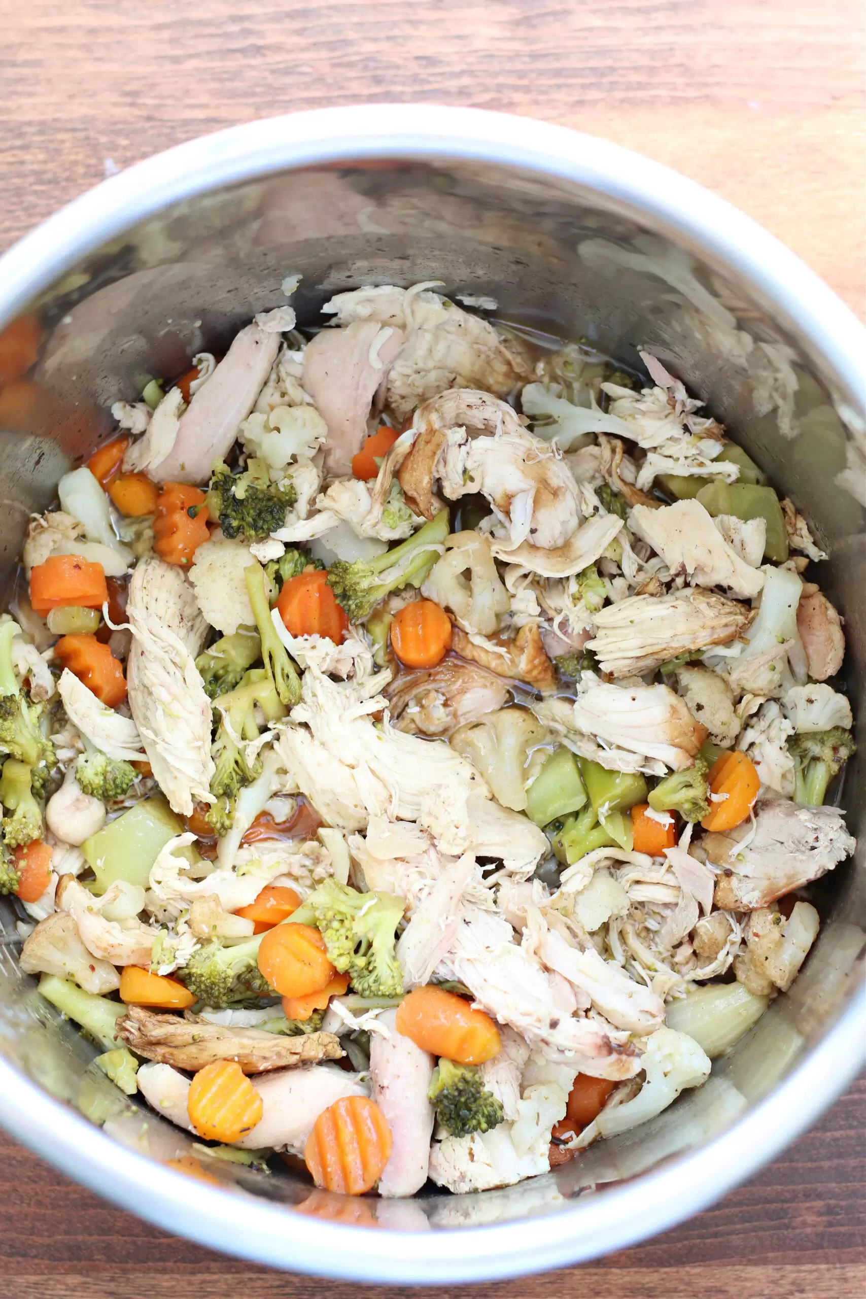 Add the rotisserie chicken and frozen vegetables to the pot. No need to thaw the veggies first!