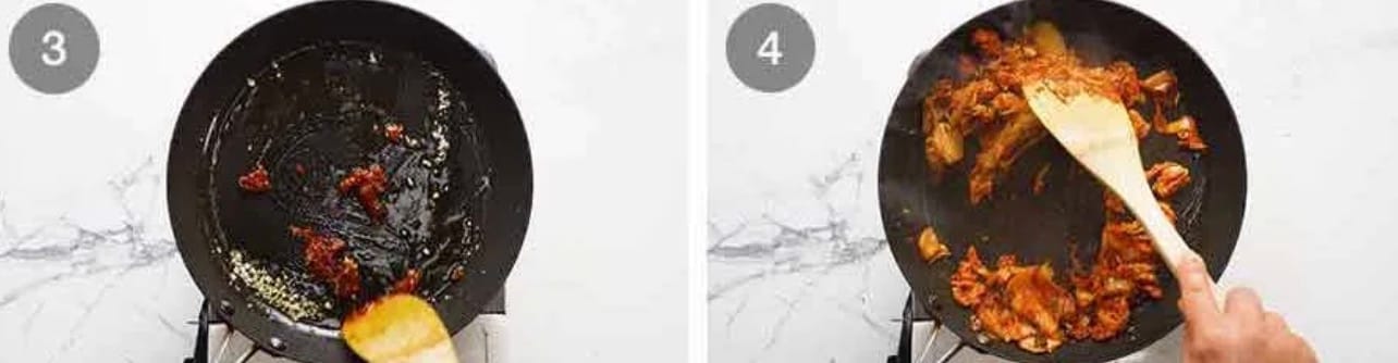 - Sauté garlic with gochujang – This takes the raw edge off the gochujang, and removes some of the excess water to keep the fried rice from going soggy. It also intensifies the gochujang flavour;