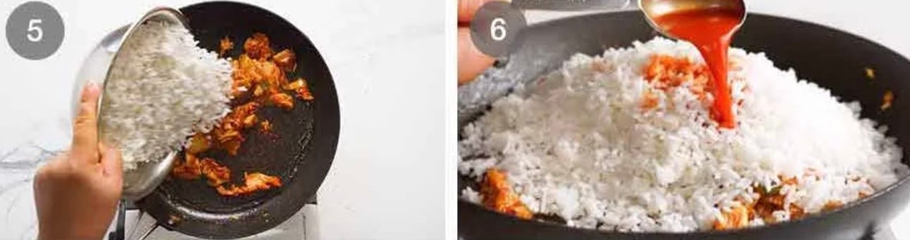 - The purpose of this step is twofold – To extract the kimchi juice which we use as the sauce for the fried rice, and to remove water from the kimchi so the fried rice doesn’t go soggy;