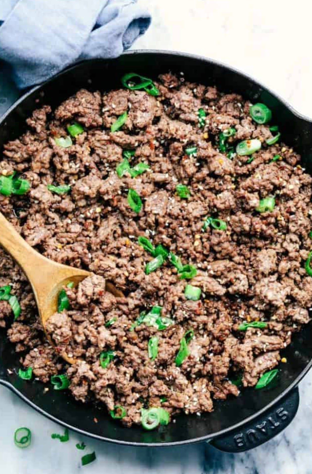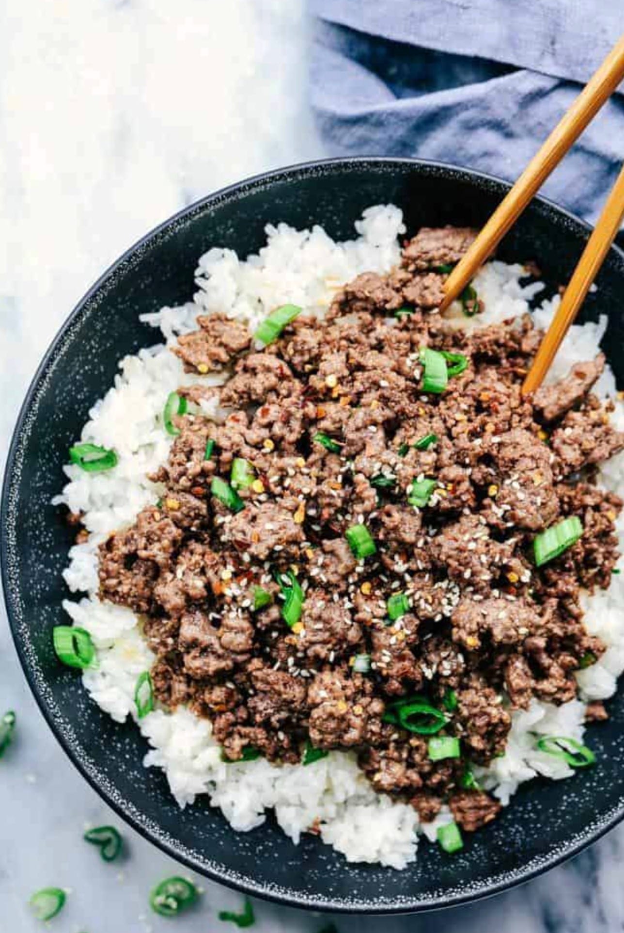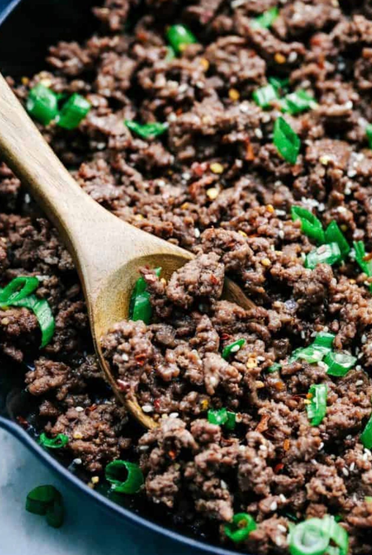 The recipe uses everyday ingredients like lean ground beef, garlic, brown sugar, and soy sauce. The beef gets seasoned with a mix of sesame oil, ginger, and red pepper flakes for a boost of Korean-inspired flavor. Top it with green onions and sesame seeds for a nice crunch and pop of color.