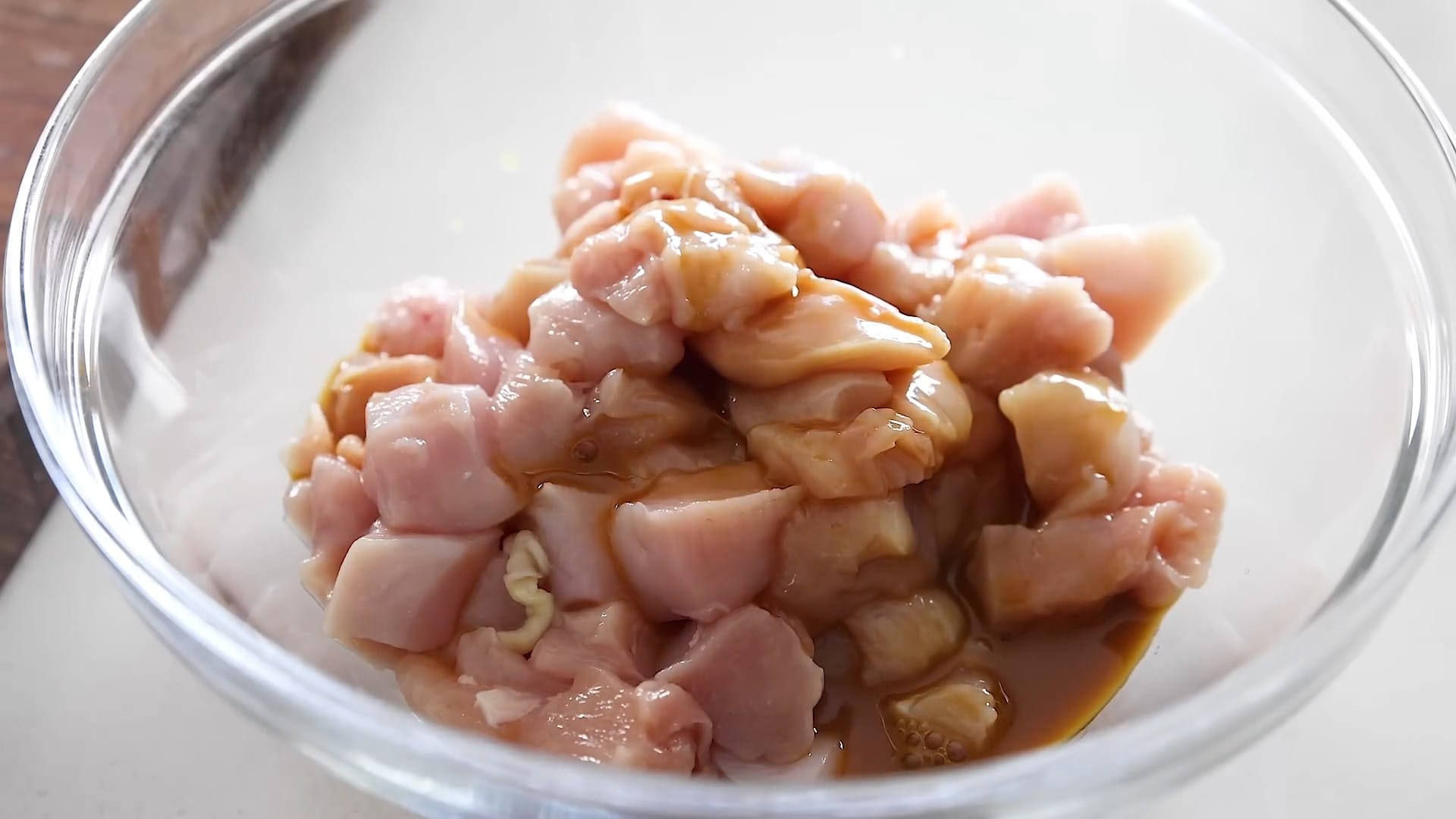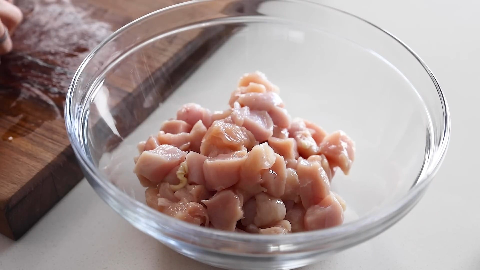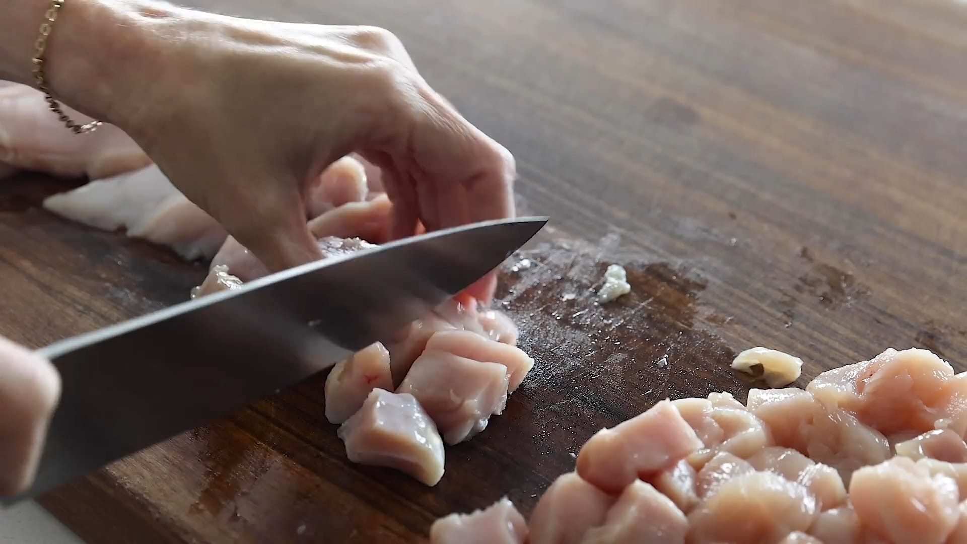 Slice the chicken breasts into small cubes (½” to ¾”).
