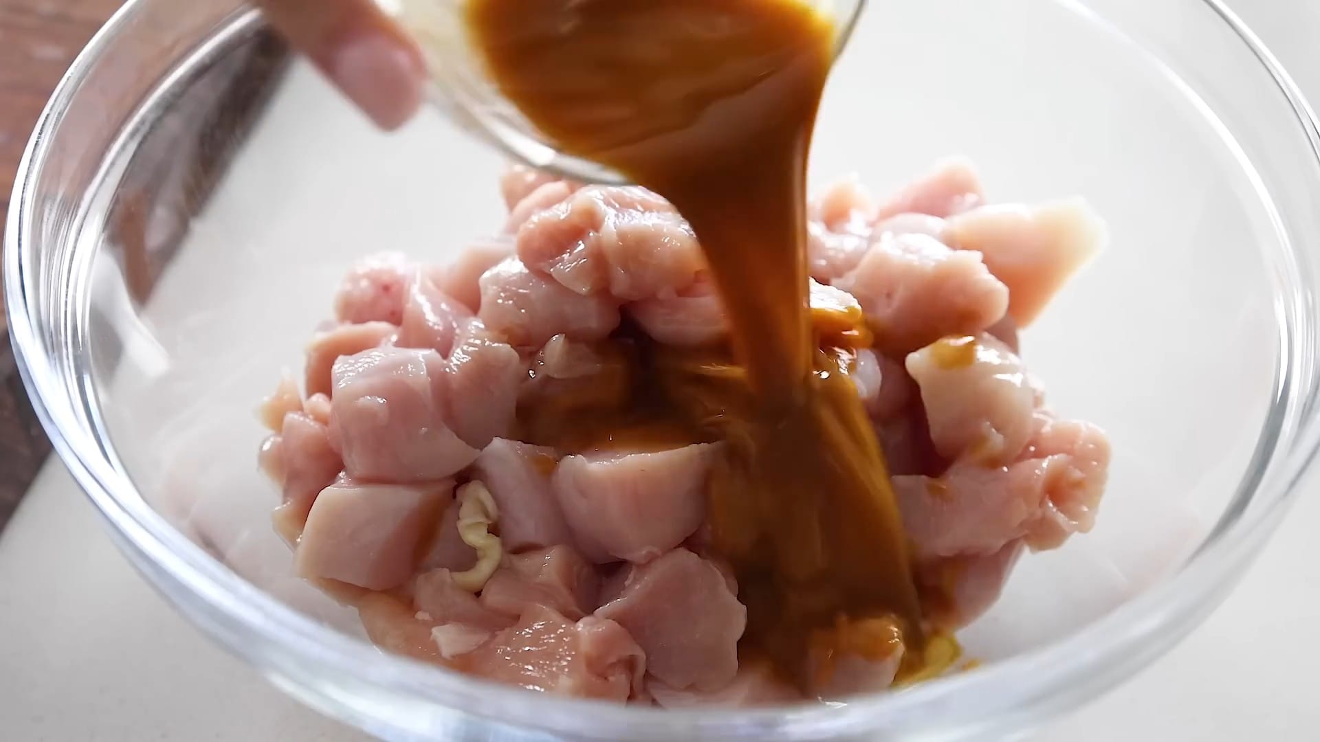In a separate bowl, whisk together 3 tbsp tamari soy sauce, 2 tbsp water, 1 tbsp dry sherry/Shaoxing wine, 1 tbsp rice vinegar, 1 tbsp honey, 1 tsp toasted sesame oil, and 2 tsp cornstarch/arrowroot powder.
