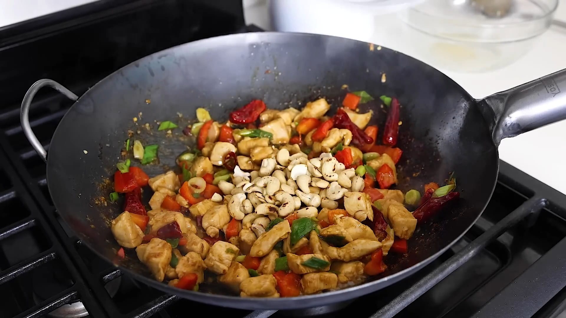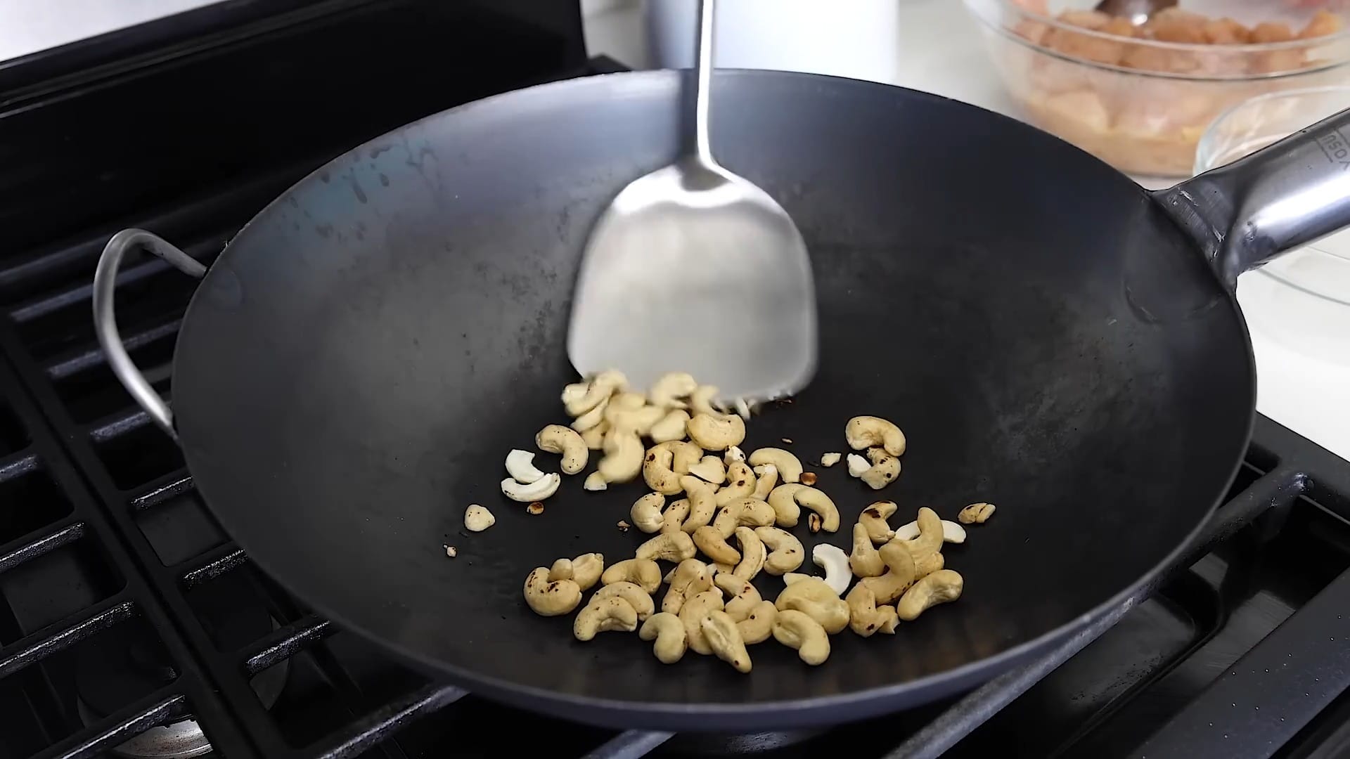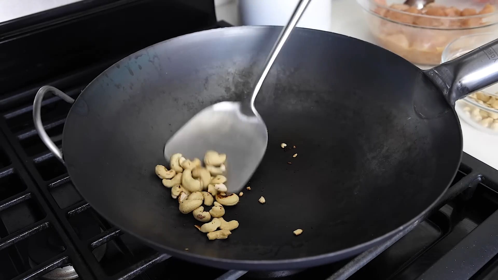 Add the raw peanuts or cashews to the hot wok and dry roast for 1 minute, stirring constantly.